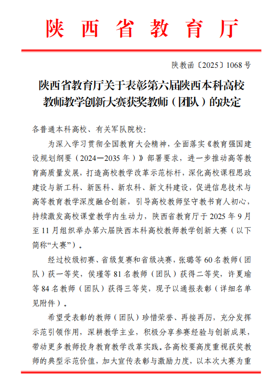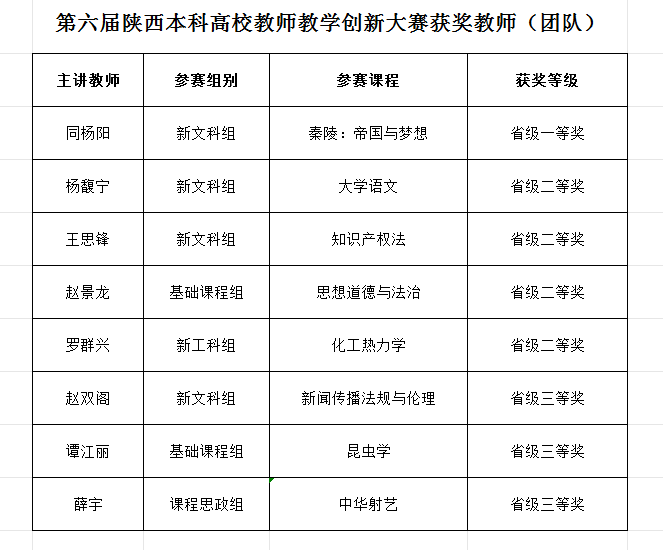 近日,陕西省教育厅公布了第六届陕西本科高校教师教学创新大赛获奖名单,MILAN.COM文化遗产学院同杨阳教师团队获省级一等奖,文学院杨馥宁教师团队、法学院王思锋教师团队、马克思主义学院赵景龙教师团队和化工学院罗群兴教师团队获省级二等奖,新闻传播学院赵双阁教师团队、生命科学学院谭江丽教师团队和体育教研部薛宇教师团队获省级三等奖。