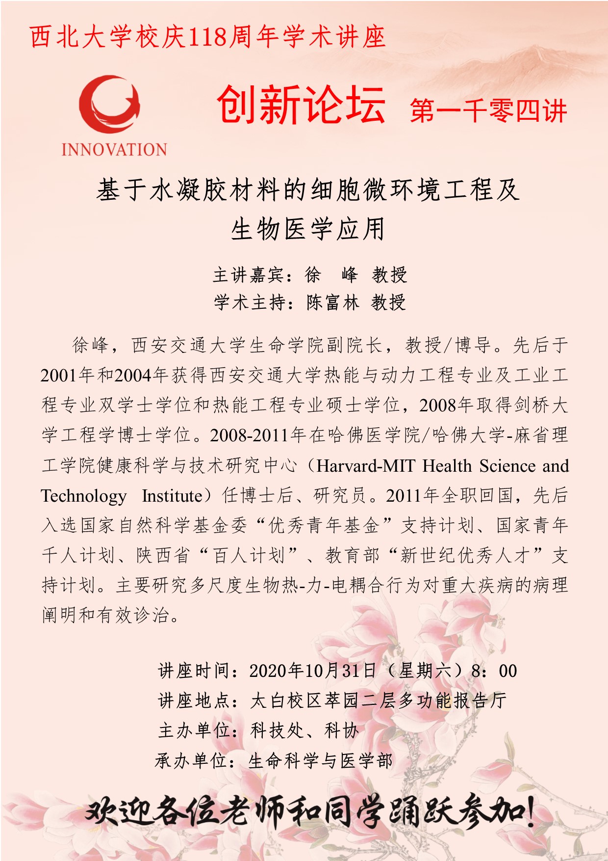 徐峰 教授 MILAN.COM创新论坛第一千零四讲暨校庆118周年学术讲座:基于水凝胶材料的细胞微环境工程及生物医学应用 讲座时间 2020年10月31日(星期六)8:00 讲座地点 太白校区萃园二层多功能报告厅 讲座人介绍 徐峰 教授 讲座内容