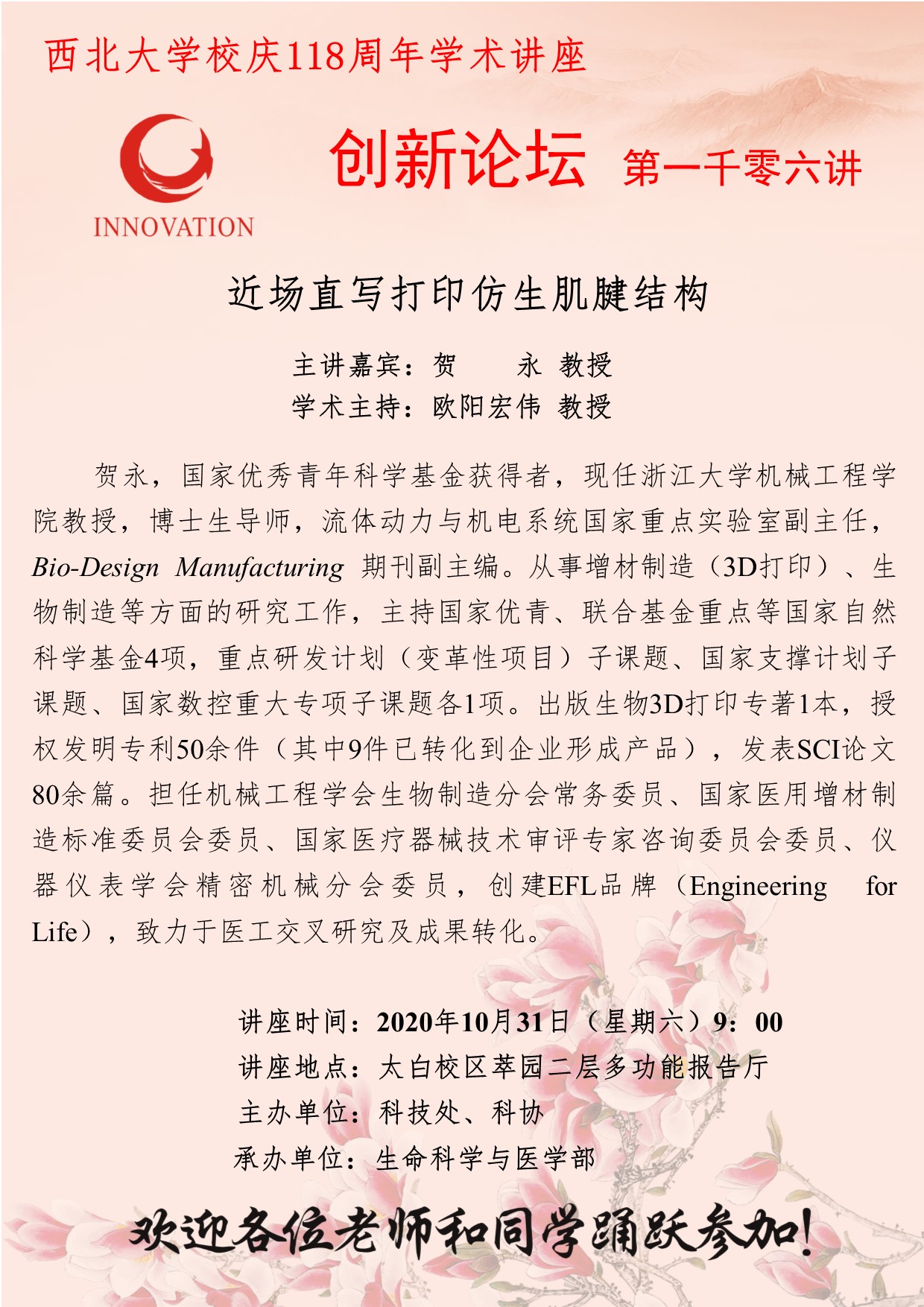贺永 教授 MILAN.COM创新论坛第一千零六讲暨校庆118周年学术讲座:近场直写打印仿生肌腱结构 讲座时间 2020年10月31日(星期六)9:00 讲座地点 太白校区萃园二层多功能报告厅 讲座人介绍 贺永 教授 讲座内容