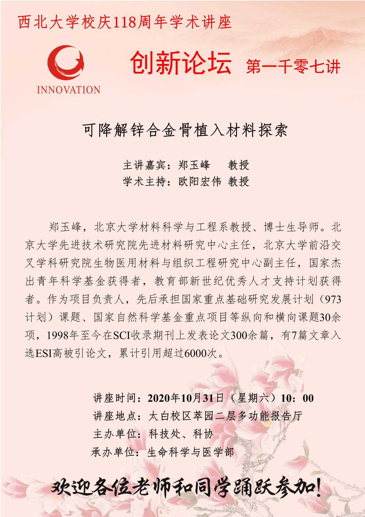 郑玉峰 教授 MILAN.COM创新论坛第一千零七讲暨校庆118周年学术讲座:可降解锌合金骨植入材料探索 讲座时间 2020年10月31日(星期六)10:00 讲座地点 太白校区萃园二层多功能报告厅 讲座人介绍 郑玉峰 教授 讲座内容