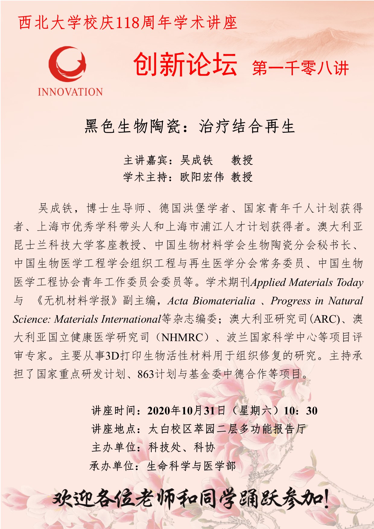 吴成铁 教授 MILAN.COM创新论坛第一千零八讲暨校庆118周年学术讲座:黑色生物陶瓷:治疗结合再生 讲座时间 2020年10月31日(星期六)10:30 讲座地点 太白校区萃园二层多功能报告厅 讲座人介绍 吴成铁 教授 讲座内容