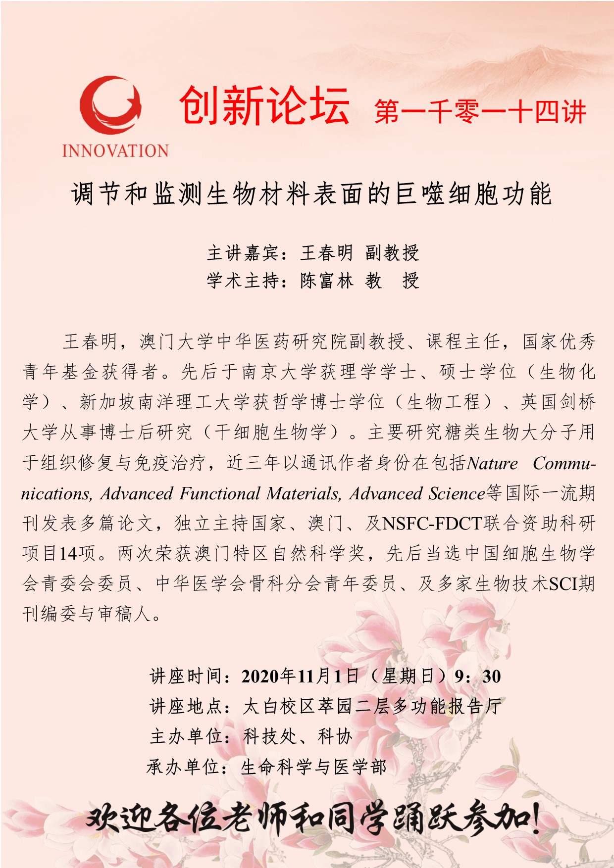 王春明 副教授 MILAN.COM创新论坛第一千零一十四讲:调节和监测生物材料表面的巨噬细胞功能 讲座时间 2020年11月1日(星期日)9:30 讲座地点 太白校区萃园二层多功能报告厅 讲座人介绍 王春明 副教授 讲座内容