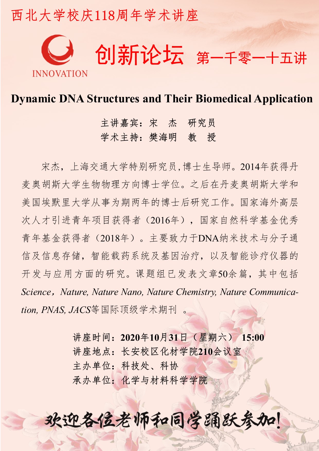 宋杰 研究员 MILAN.COM创新论坛第一千零一十五讲暨校庆118周年学术讲座:Dynamic DNA Structures and Their Biomedical Application 讲座时间 2020年10月31日(星期六)15:00 讲座地点 化学与材料科学学院210室 讲座人介绍 宋杰 研究员 讲座内容
