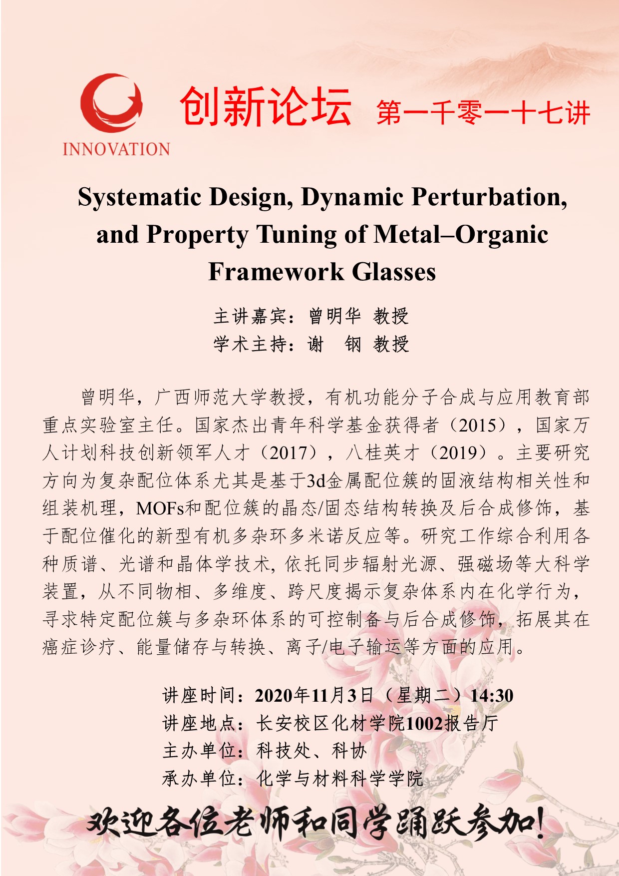 曾明华 教授 MILAN.COM创新论坛第一千零一十七讲:Systematic Design, Dynamic Perturbation, and Property Tuning of Metal–Organic Framework Glasses 讲座时间 2020年11月3日(星期二)14:30 讲座地点 长安校区化材学院1002报告厅 讲座人介绍 曾明华 教授 讲座内容