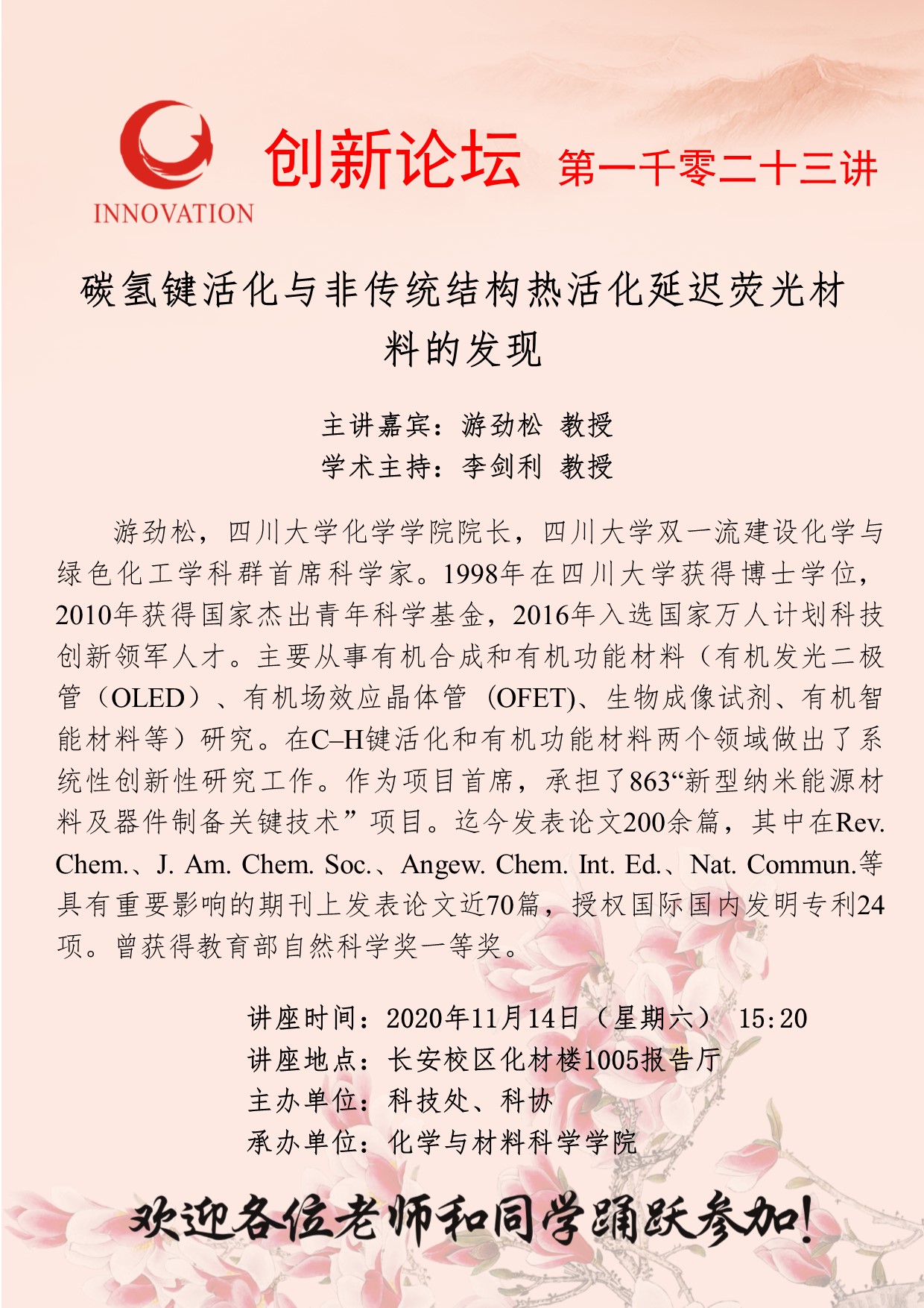 游劲松 教授 MILAN.COM创新论坛第一千零二十三讲:碳氢键活化与非传统结构热活化延迟荧光材料的发现 讲座时间 2020年 11月14日(周六)15:20 讲座地点 长安校区化材楼1005报告厅 讲座人介绍 游劲松 教授 讲座内容