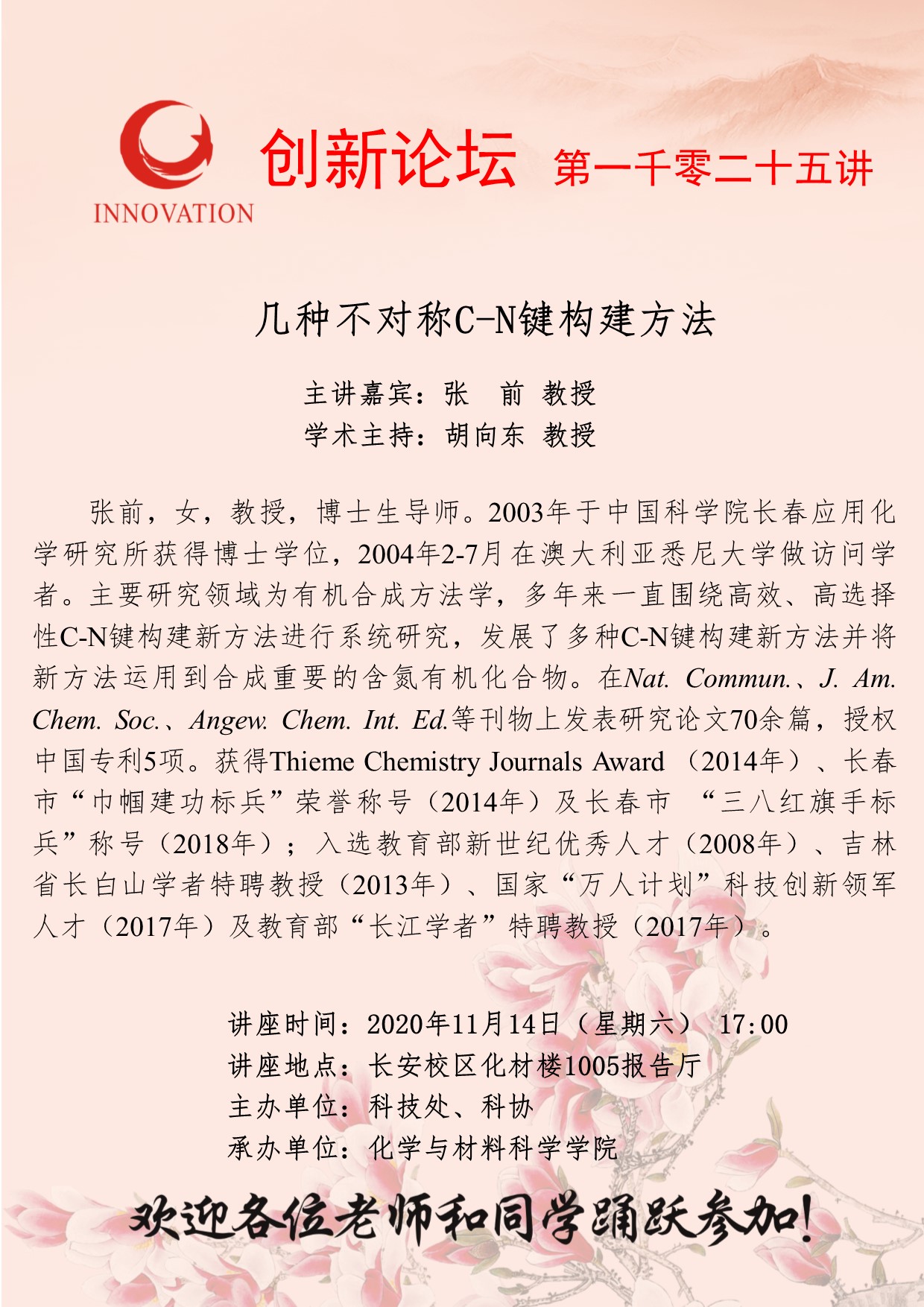 张前 教授 MILAN.COM创新论坛第一千零二十五讲:几种不对称C-N键构建方法 讲座时间 2020年11月14日(周六)17:00 讲座地点 长安校区化材楼1005报告厅 讲座人介绍 张前 教授 讲座内容