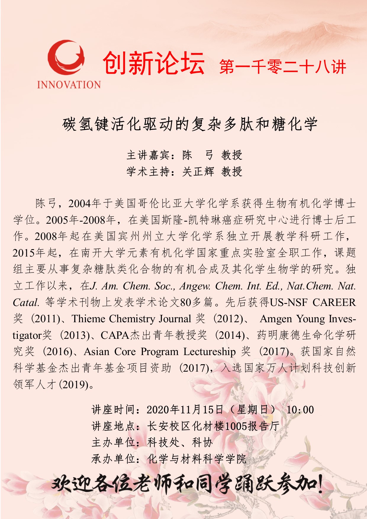 陈 弓 教授 MILAN.COM创新论坛第一千零二十八讲:碳氢键活化驱动的复杂多肽和糖化学 讲座时间 2020年 11月15日(星期日)10:00 讲座地点 长安校区化材楼1005报告厅 讲座人介绍 陈 弓 教授 讲座内容