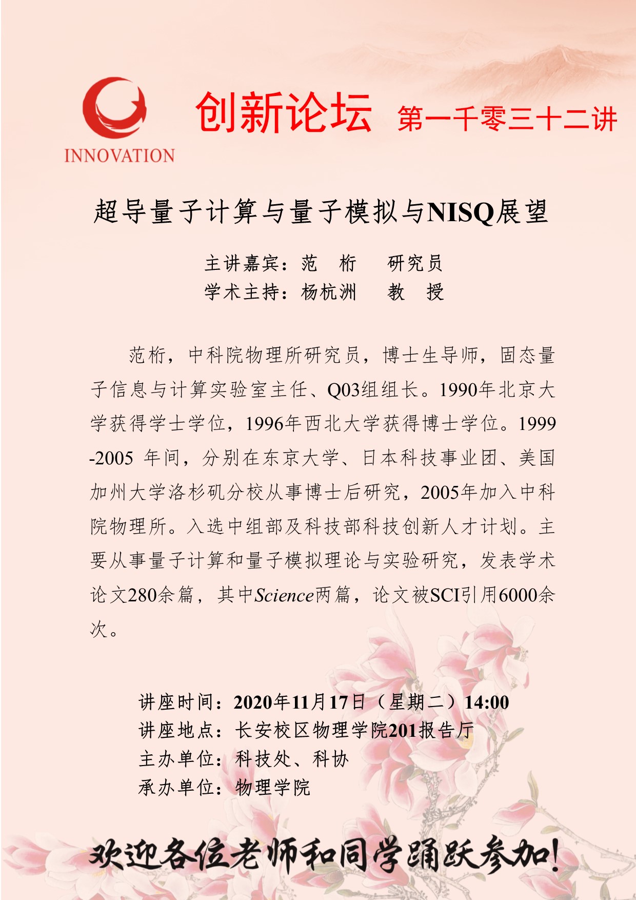 范 桁 研究员 MILAN.COM创新论坛第一千零三十二讲:超导量子计算与量子模拟与NISQ展望 讲座时间 2020年11月17日(星期二)14:00 讲座地点 长安校区物理学院201报告厅 讲座人介绍 范 桁 研究员 讲座内容