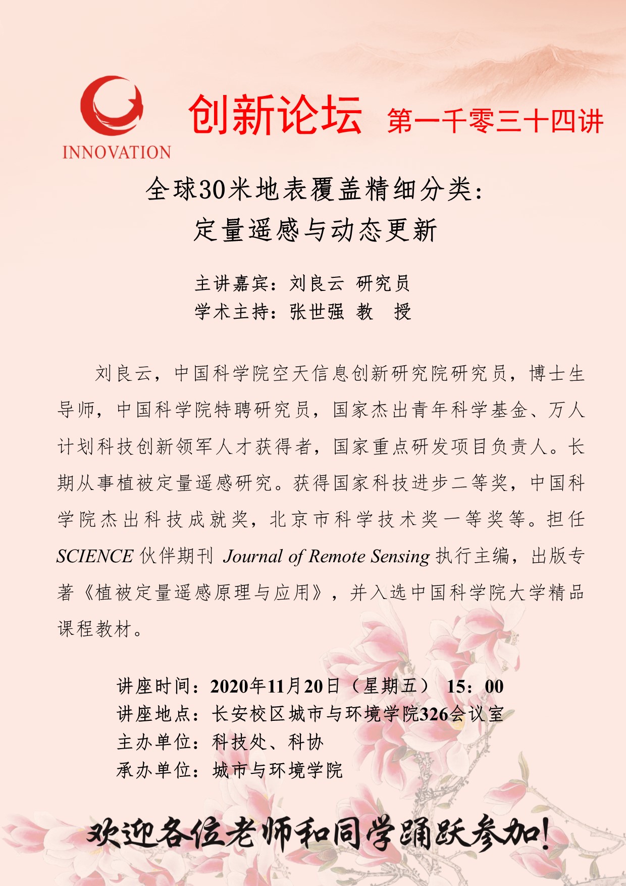 刘良云 研究员 MILAN.COM创新论坛第一千零三十四讲:全球30米地表覆盖精细分类:定量遥感与动态更新 讲座时间 2020年11月20日(星期五) 15:00 讲座地点 长安校区城市与环境学院326会议室 讲座人介绍 刘良云 研究员 讲座内容