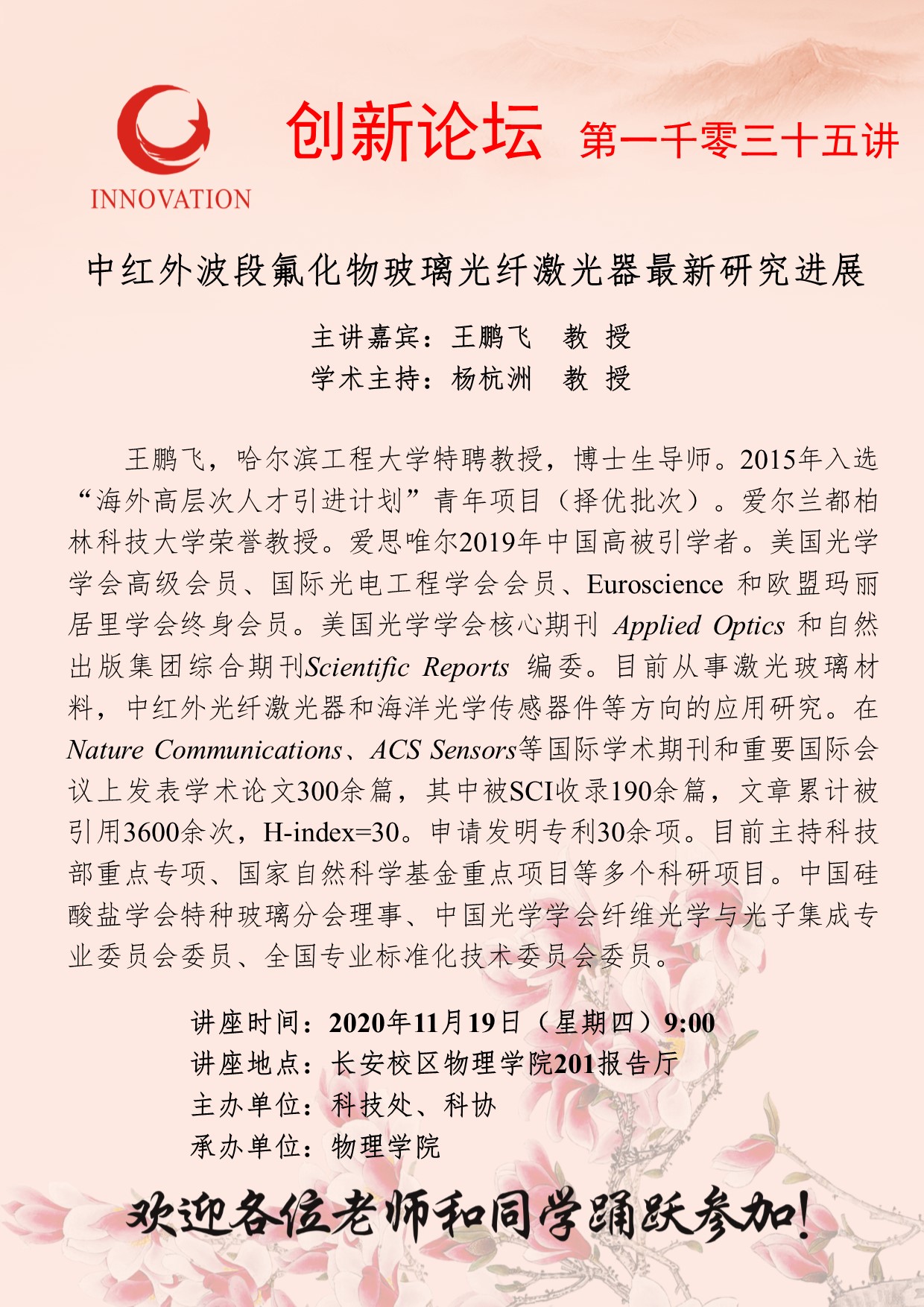 王鹏飞 教授 MILAN.COM创新论坛第一千零三十五讲:中红外波段氟化物玻璃光纤激光器最新研究进展 讲座时间 2020年11月19日(星期四) 9:00 讲座地点 长安校区物理学院201报告厅 讲座人介绍 王鹏飞 教授 讲座内容
