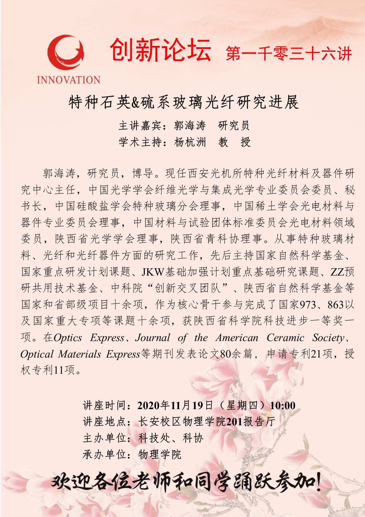 郭海涛 研究员 MILAN.COM创新论坛第一千零三十六讲:特种石英&硫系玻璃光纤研究进展 讲座时间 2020年11月19日(星期四)10:00 讲座地点 长安校区物理学院201报告厅 讲座人介绍 郭海涛 研究员 讲座内容