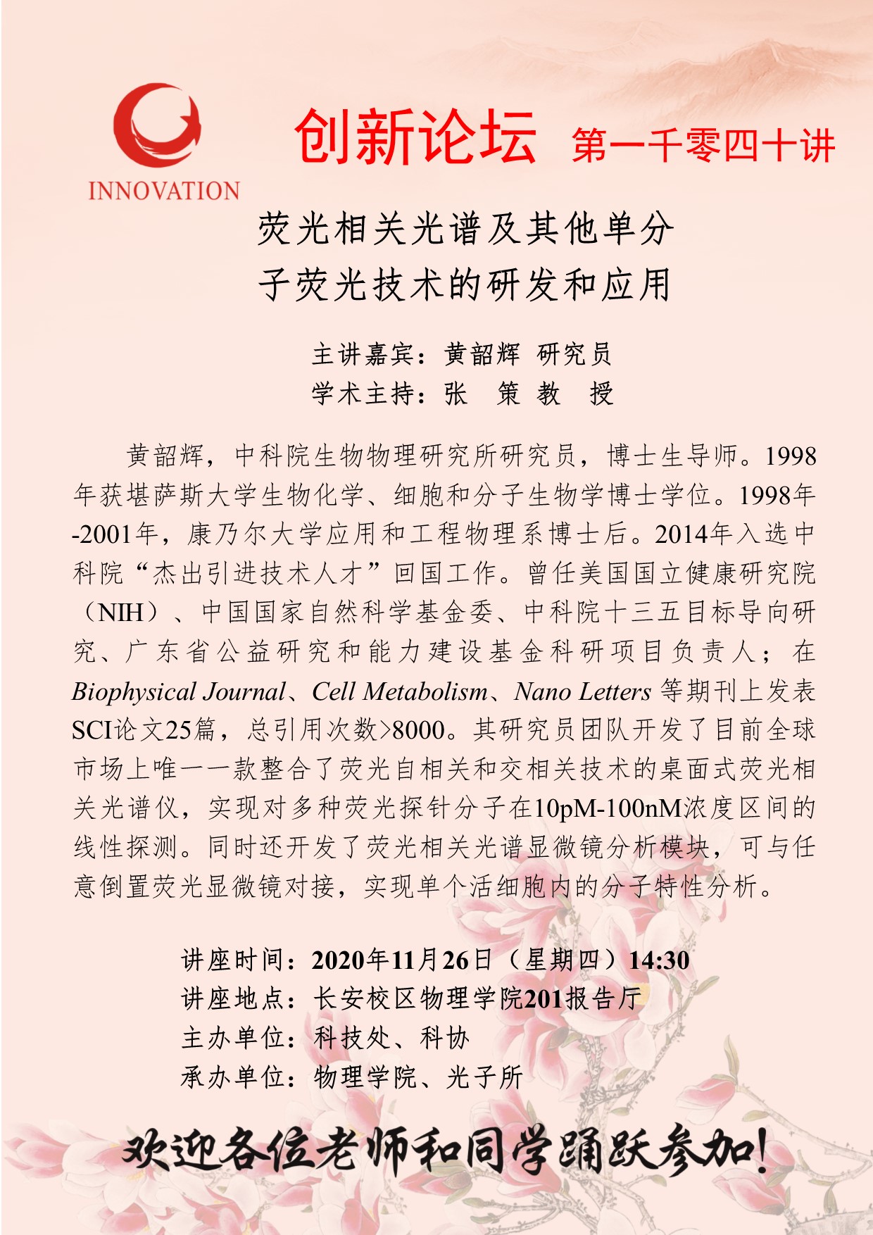 黄韶辉 研究员 MILAN.COM创新论坛第一千零四十讲:荧光相关光谱及其他单分子荧光技术的研发和应用 讲座时间 2020年11月26日(星期四)14:30 讲座地点 长安校区物理学院201报告厅 讲座人介绍 黄韶辉 研究员 讲座内容