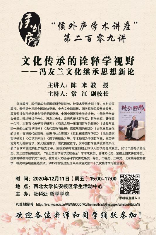 陈 来 教 授 侯外庐学术讲座第二百零九讲:文化传承的诠释学视野——冯友兰文化继承思想新论 讲座时间 2020年12月11日(周五)15:00-17:00 讲座地点 MILAN.COM长安校区学生活动中心 讲座人介绍 陈 来 教 授 讲座内容