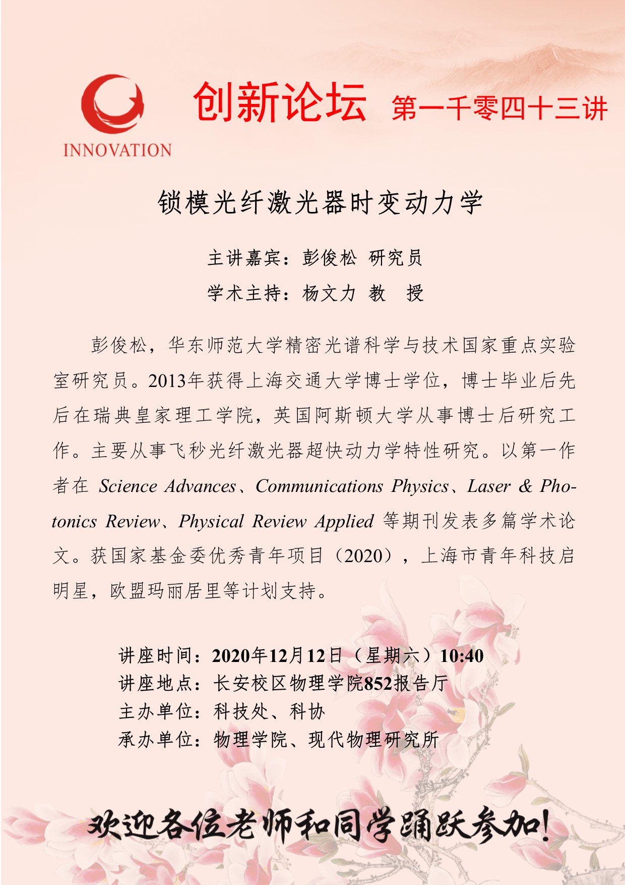 彭俊松 研究员 MILAN.COM创新论坛第一千零四十三讲:锁模光纤激光器时变动力学 讲座时间 2020年12月12日(星期六)10:40 讲座地点 长安校区物理学院852报告厅 讲座人介绍 彭俊松 研究员 讲座内容
