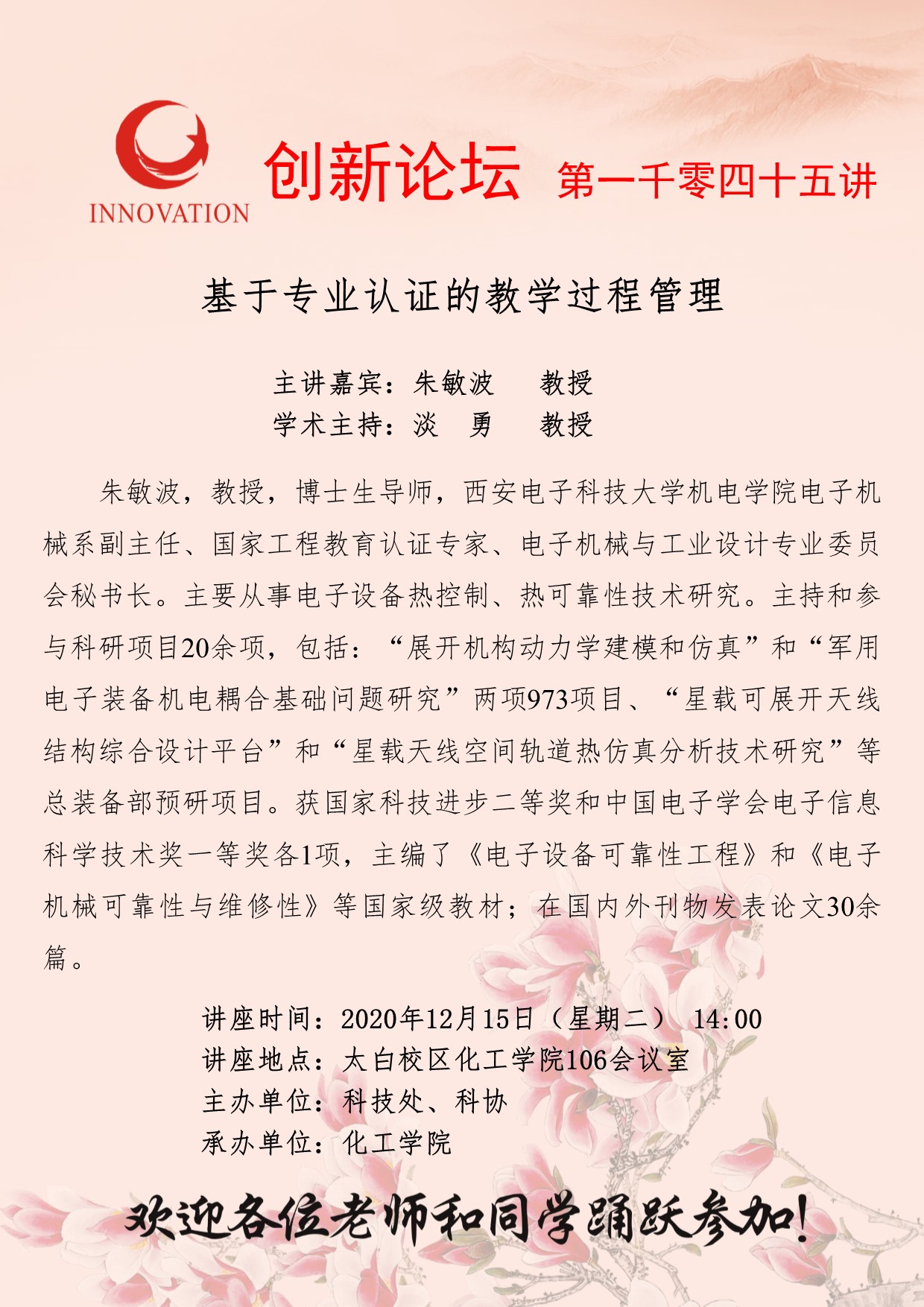 朱敏波 教授 MILAN.COM创新论坛第一千零四十五讲:基于专业认证的教学过程管理 讲座时间 2020年12月15日(星期二) 14:00 讲座地点 太白校区化工学院106会议室 讲座人介绍 朱敏波 教授 讲座内容