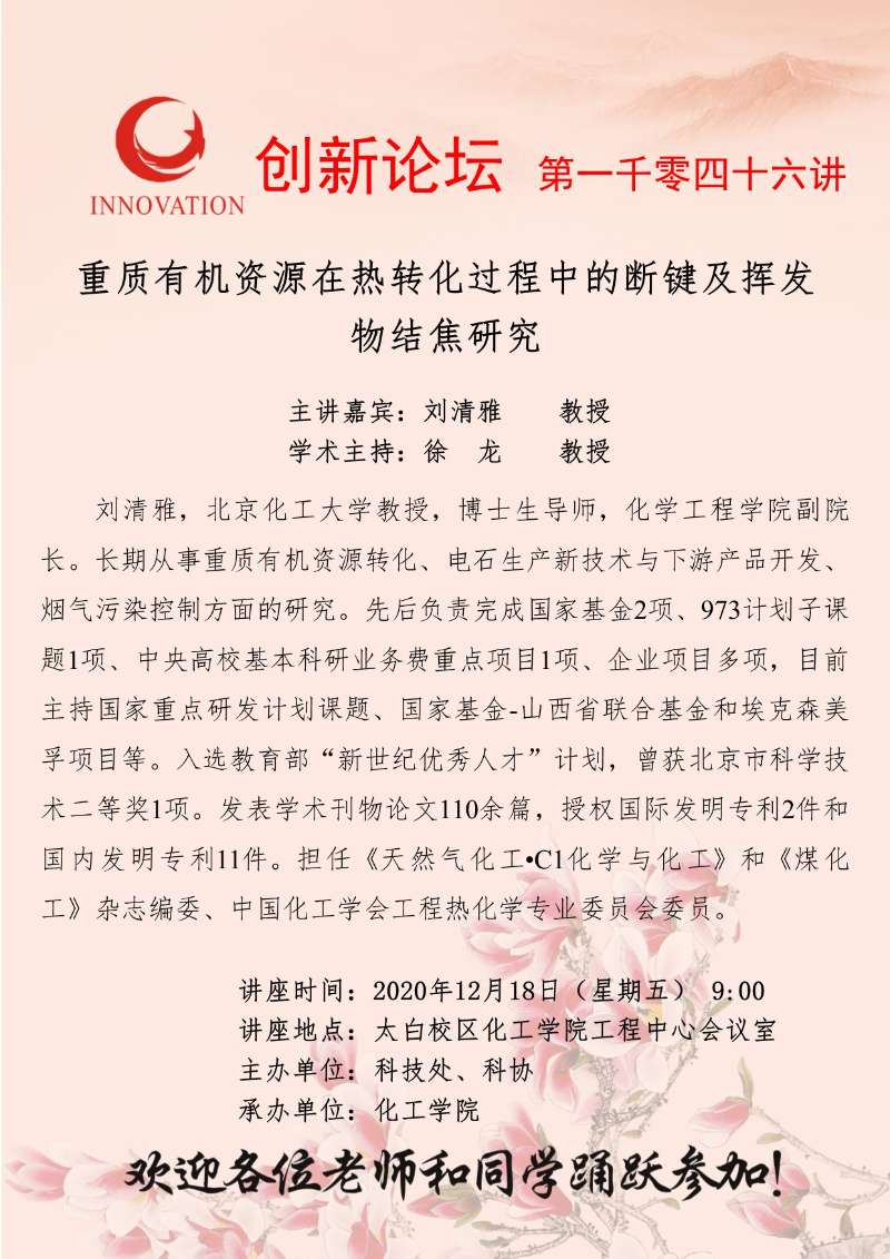 刘清雅 教授 MILAN.COM创新论坛第一千零四十六讲:重质有机资源在热转化过程中的断键及挥发物结焦研究 讲座时间 2020年12月18日(星期五) 9:00 讲座地点 太白校区化工学院工程中心会议室 讲座人介绍 刘清雅 教授 讲座内容