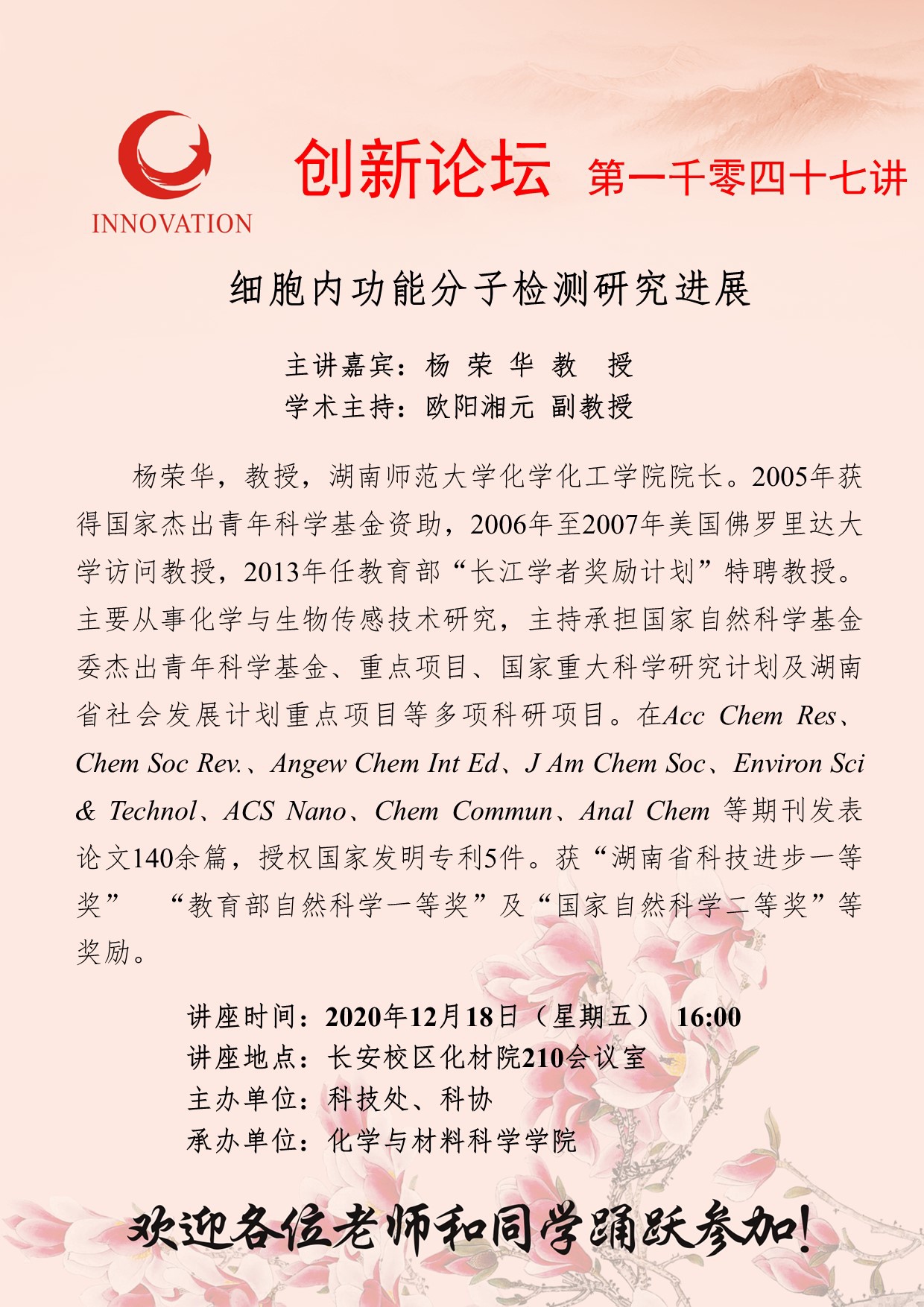 杨荣华 教授 MILAN.COM创新论坛第一千零四十七讲:细胞内功能分子检测研究进展 讲座时间 2020年12月18日(星期五) 16:00 讲座地点 长安校区化材院210会议室 讲座人介绍 杨荣华 教授 讲座内容