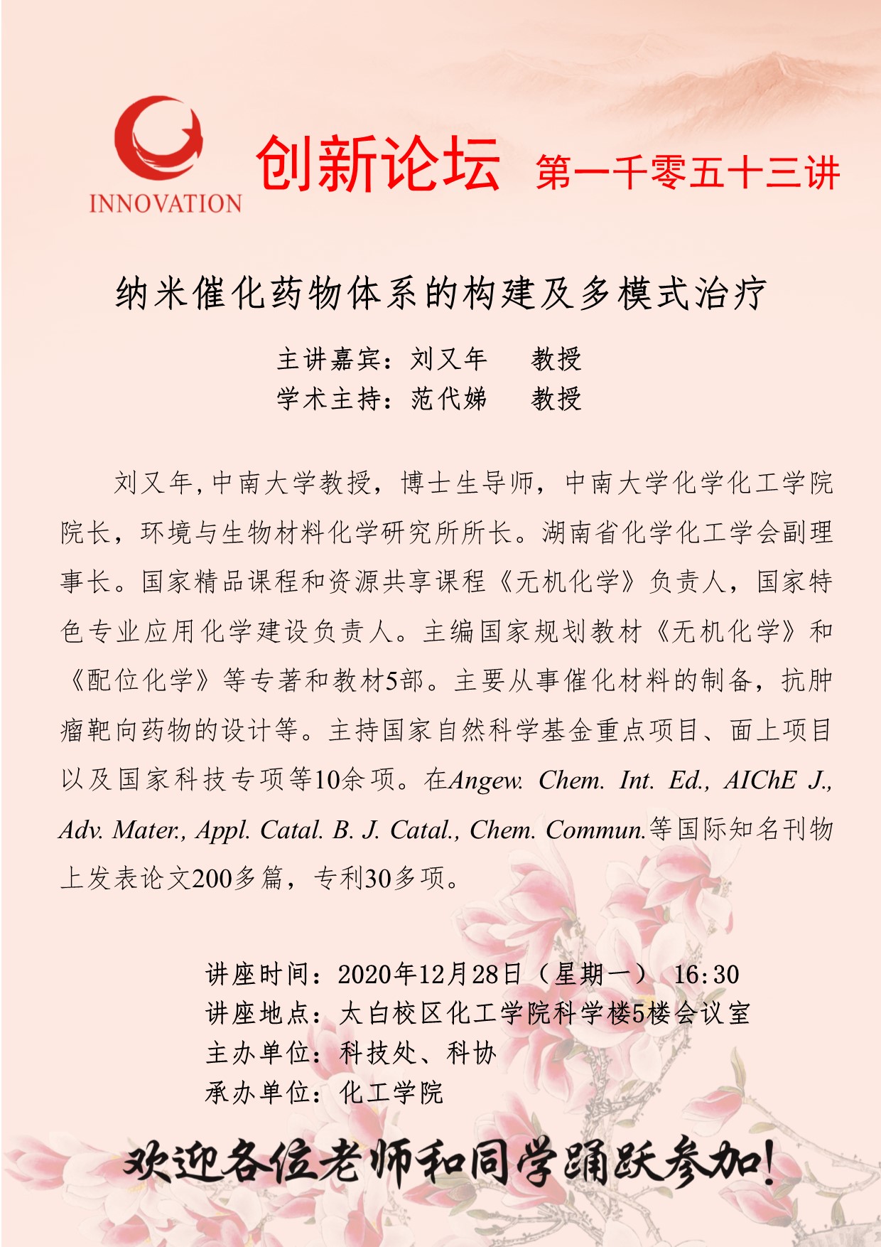 刘又年 教授 MILAN.COM创新论坛第一千零五十三讲:纳米催化药物体系的构建及多模式治疗 讲座时间 2020年12月28日(星期一) 16:30 讲座地点 太白校区化工学院科学楼5楼会议室 讲座人介绍 刘又年 教授 讲座内容