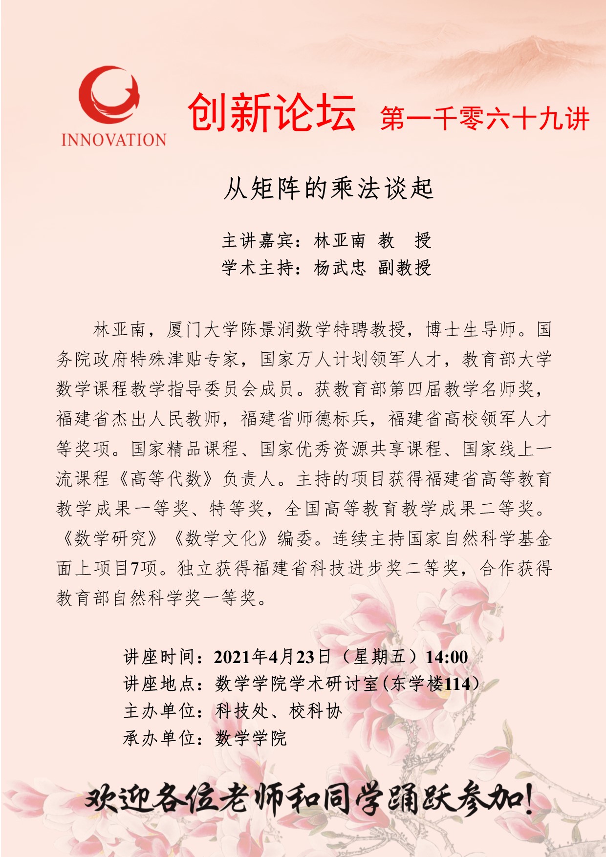 林亚南 教授 MILAN.COM创新论坛第一千零六十九讲:从矩阵的乘法谈起 讲座时间 2021年4月23日(星期五)14:00 讲座地点 数学学院学术研讨室(东学楼114) 讲座人介绍 林亚南 教授 讲座内容