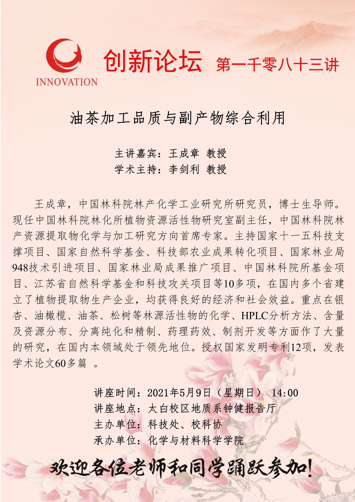 王成章 教授 MILAN.COM创新论坛第一千零八十三讲:油茶加工品质与副产物综合利用 讲座时间 2021年5月9日(星期日) 14:00 讲座地点 太白校区地质系钟健报告厅 讲座人介绍 王成章 教授 讲座内容