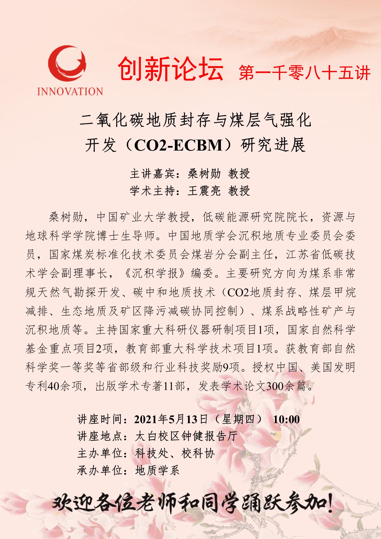桑树勋 教授 MILAN.COM创新论坛第一千零八十五讲:二氧化碳地质封存与煤层气强化开发(CO2-ECBM)研究进展 讲座时间 2021年5月13日(星期四) 10:00 讲座地点 太白校区钟健报告厅 讲座人介绍 桑树勋 教授 讲座内容