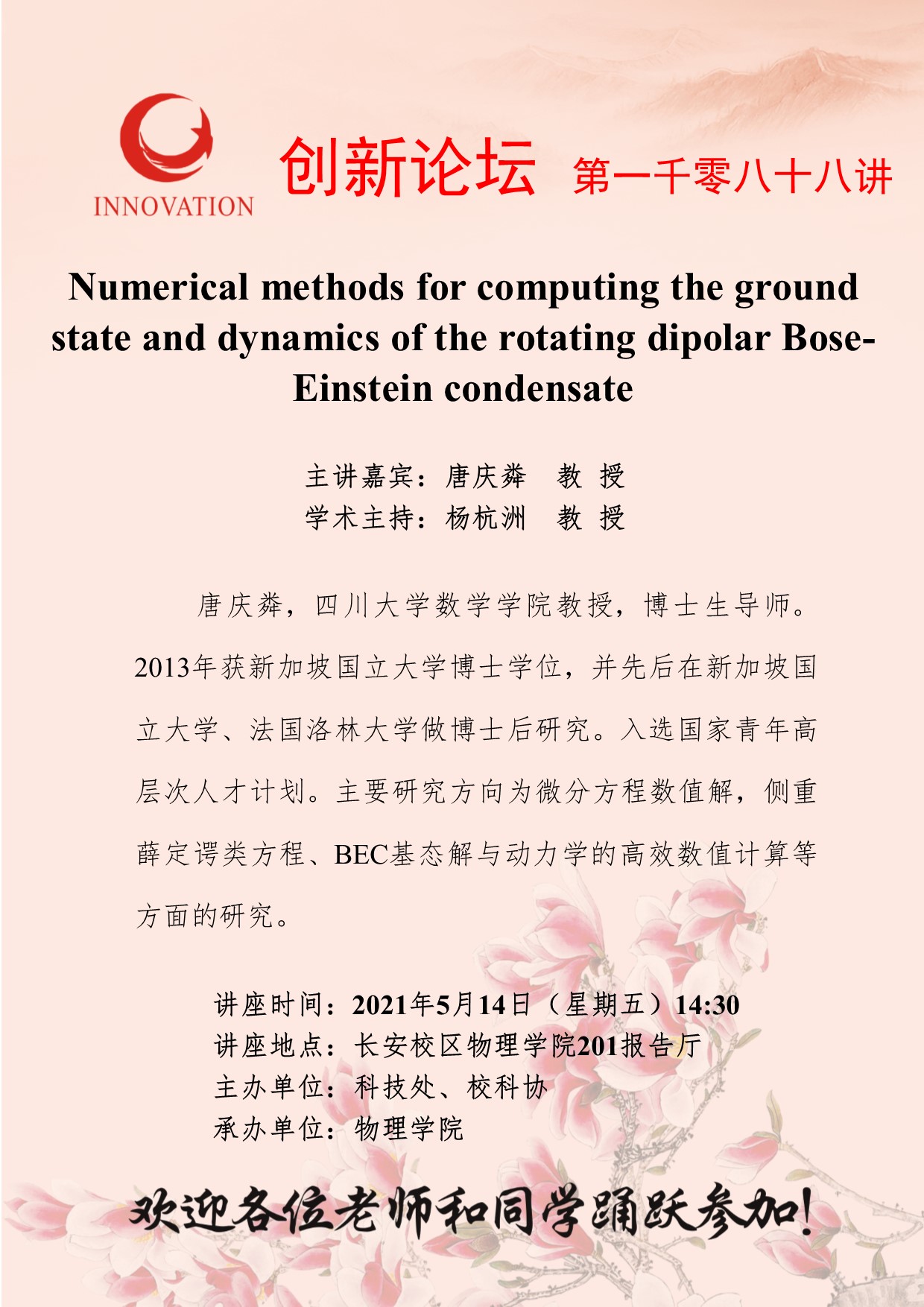 唐庆粦 教 授 MILAN.COM创新论坛第一千零八十八讲:Numerical methods for computing the ground state and dynamics of the rotating dipolar Bose-Einstein condensate 讲座时间 2021年5月14日(星期五)14:30 讲座地点 长安校区物理学院201报告厅 讲座人介绍 唐庆粦 教 授 讲座内容