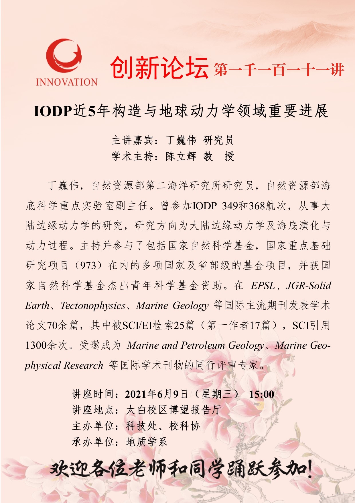 丁巍伟 研究员 MILAN.COM创新论坛第一千一百一十一讲:IODP近5年构造与地球动力学领域重要进展 讲座时间 2021年6月9日(星期三) 15:00 讲座地点 太白校区博望报告厅 讲座人介绍 丁巍伟 研究员 讲座内容