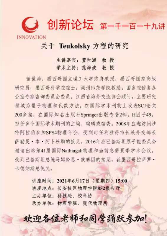 董世海 教 授 MILAN.COM创新论坛第一千一百一十九讲:关于 Teukolsky 方程的研究 讲座时间 2021年6月17日(星期四)15:00 讲座地点 长安校区物理学院852报告厅 讲座人介绍 董世海 教 授 讲座内容