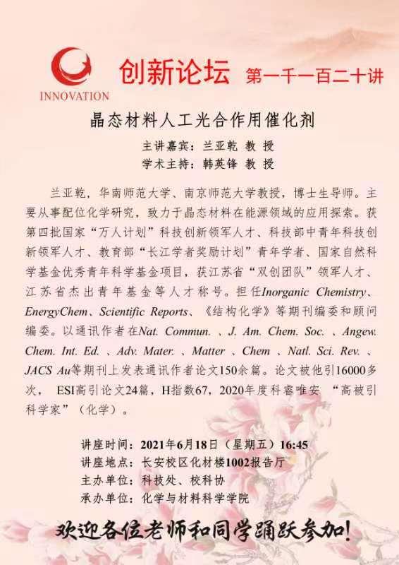 兰亚乾 教 授 MILAN.COM创新论坛第一千一百二十讲:晶态材料人工光合作用催化剂 讲座时间 2021年6月18日(星期五)16:45 讲座地点 长安校区化材楼1002报告厅 讲座人介绍 兰亚乾 教 授 讲座内容