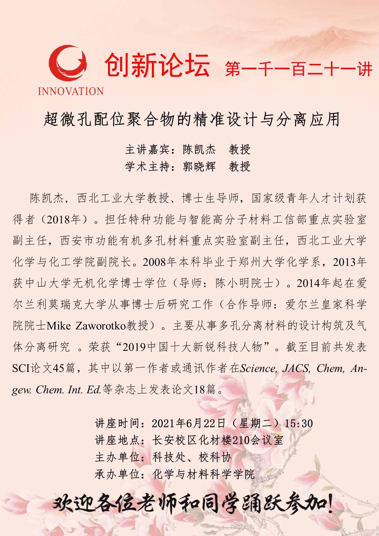 陈凯杰 教授 MILAN.COM创新论坛第一千一百二十一讲:超微孔配位聚合物的精准设计与分离应用 讲座时间 2021年6月22日(星期二)15:30 讲座地点 长安校区化材楼210会议室 讲座人介绍 陈凯杰 教授 讲座内容