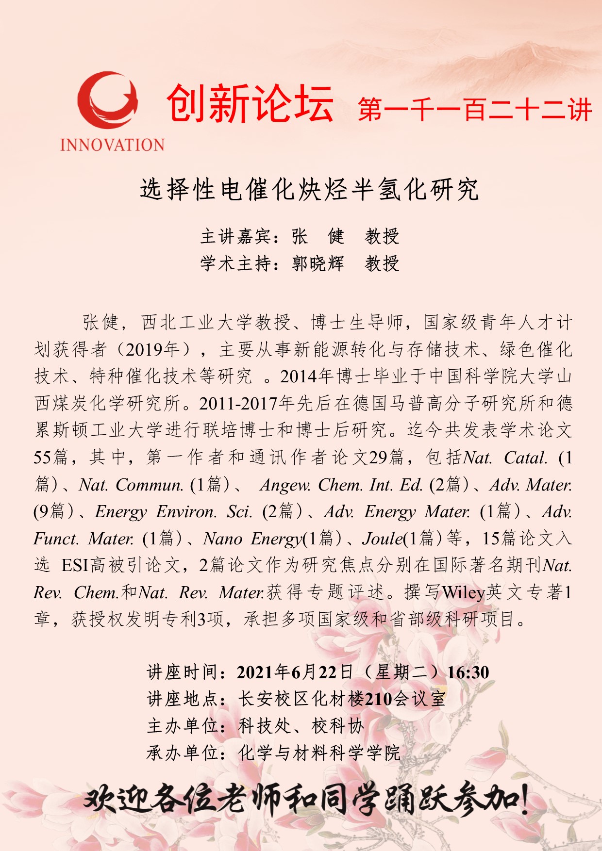 张 健 教授 MILAN.COM创新论坛第一千一百二十二讲:选择性电催化炔烃半氢化研究 讲座时间 2021年6月22日(星期二)16:30 讲座地点 长安校区化材楼210会议室 讲座人介绍 张 健 教授 讲座内容