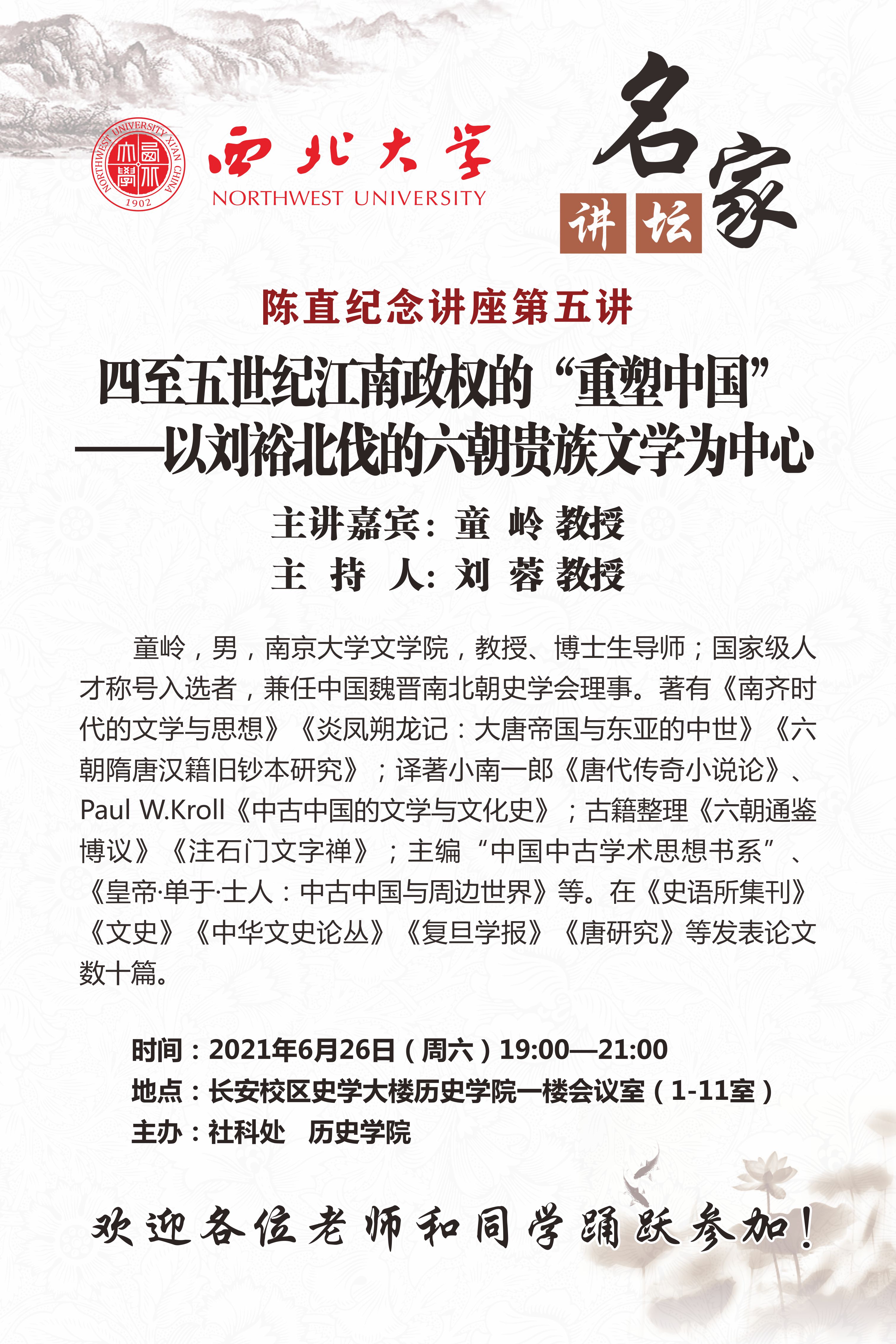 名家讲坛:四至五世纪江南政权的“重塑中国”——以刘裕北伐的六朝贵族文学为中心