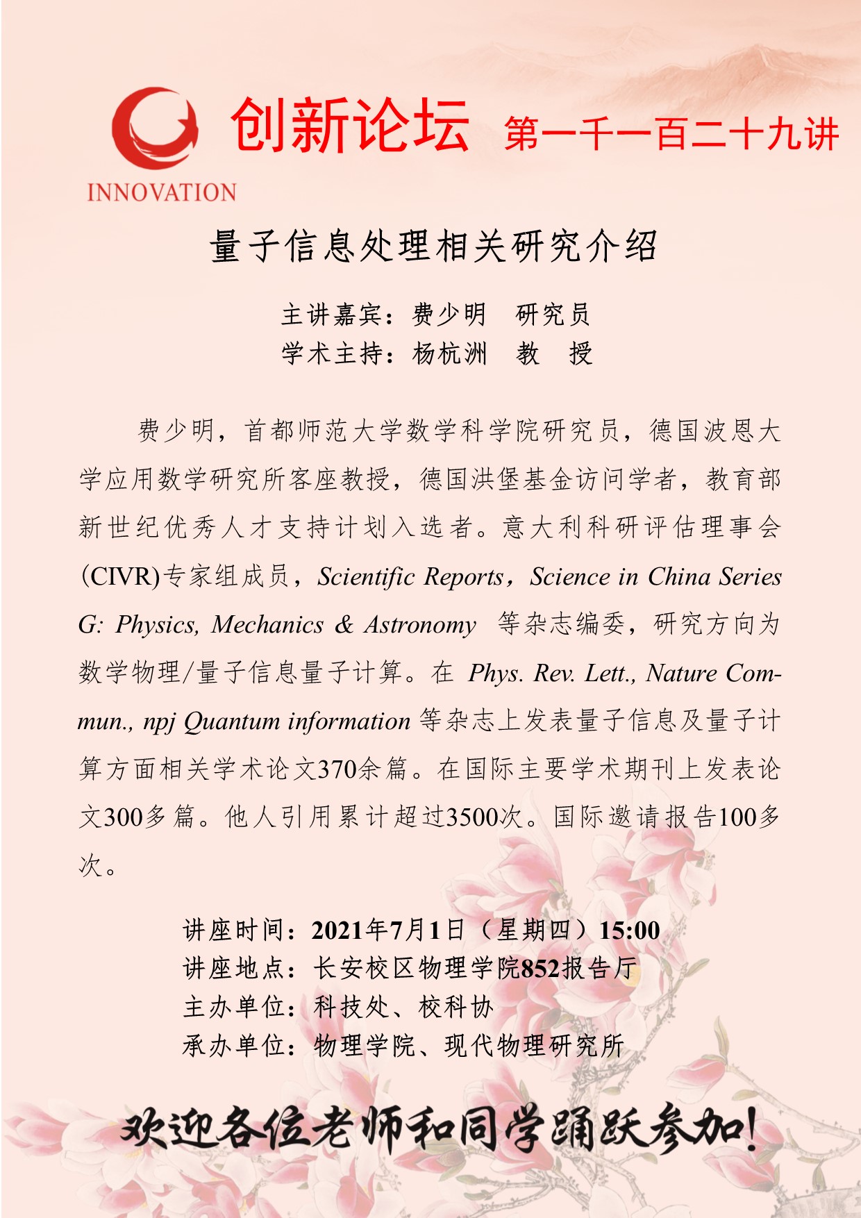 费少明 研究员 MILAN.COM创新论坛第一千一百二十九讲:量子信息处理相关研究介绍 讲座时间 2021年7月1日(星期四)15:00 讲座地点 长安校区物理学院852报告厅 讲座人介绍 费少明 研究员 讲座内容