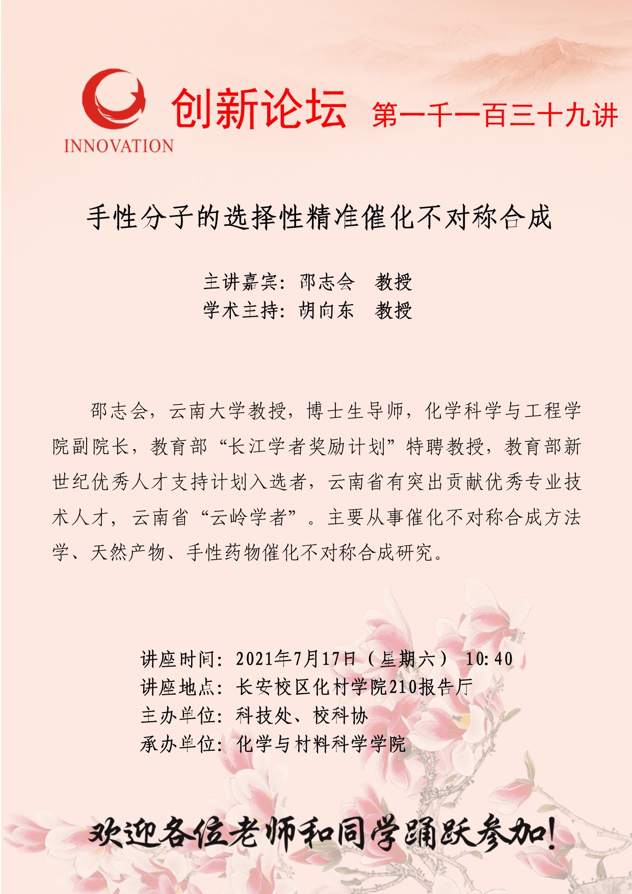 邵志会 教授 MILAN.COM创新论坛第一千一百三十九讲:手性分子的选择性精准催化不对称合成 讲座时间 2021年7月17日(星期六) 10:40 讲座地点 长安校区化材学院210报告厅 讲座人介绍 邵志会 教授 讲座内容