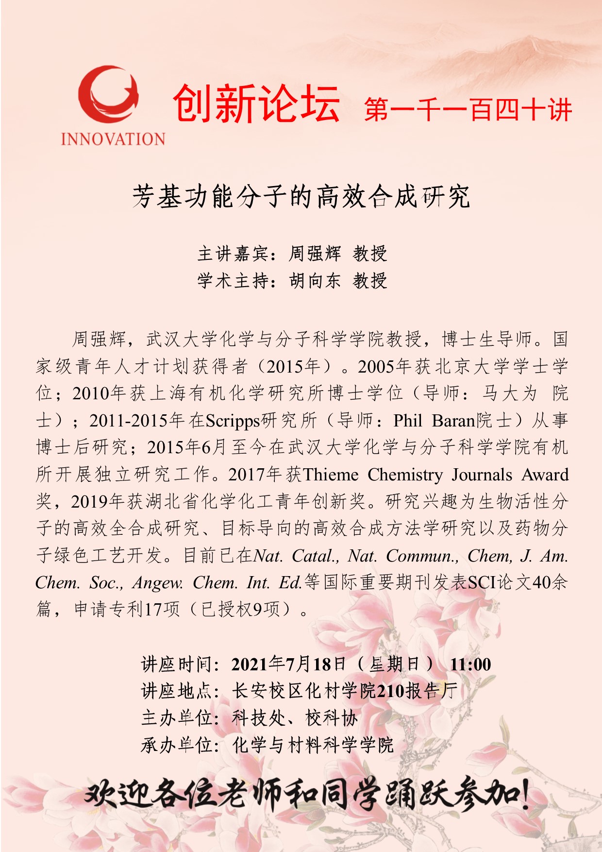 周强辉 教授 MILAN.COM创新论坛第一千一百四十讲:芳基功能分子的高效合成研究 讲座时间 2021年7月18日(星期日) 11:00 讲座地点 长安校区化材学院210报告厅 讲座人介绍 周强辉 教授 讲座内容