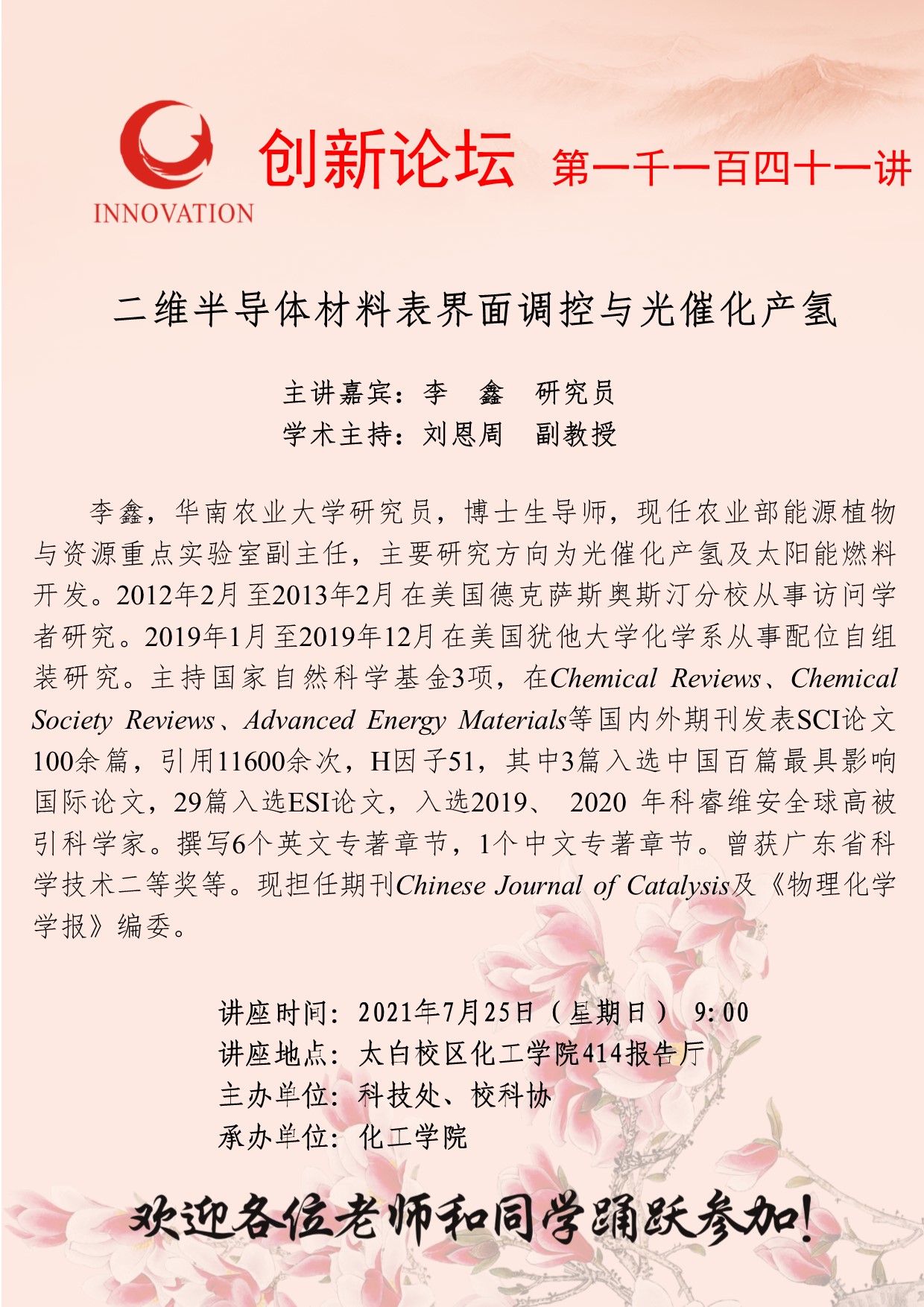 李鑫 研究员 MILAN.COM创新论坛第一千一百四十一讲:二维半导体材料表界面调控与光催化产氢 讲座时间 2021年7月25日(星期日) 9:00 讲座地点 太白校区化工学院414报告厅 讲座人介绍 李鑫 研究员 讲座内容