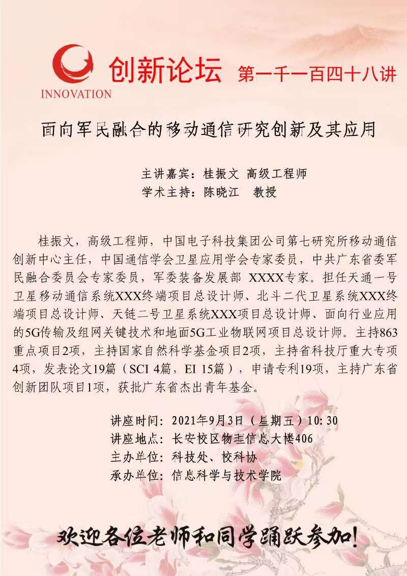 桂振文 高级工程师 MILAN.COM创新论坛第一千一百四十八讲:面向军民融合的移动通信研究创新及其应用 讲座时间 2021年9月3日(星期五)10:30 讲座地点 长安校区物理信息大楼406 讲座人介绍 桂振文 高级工程师 讲座内容