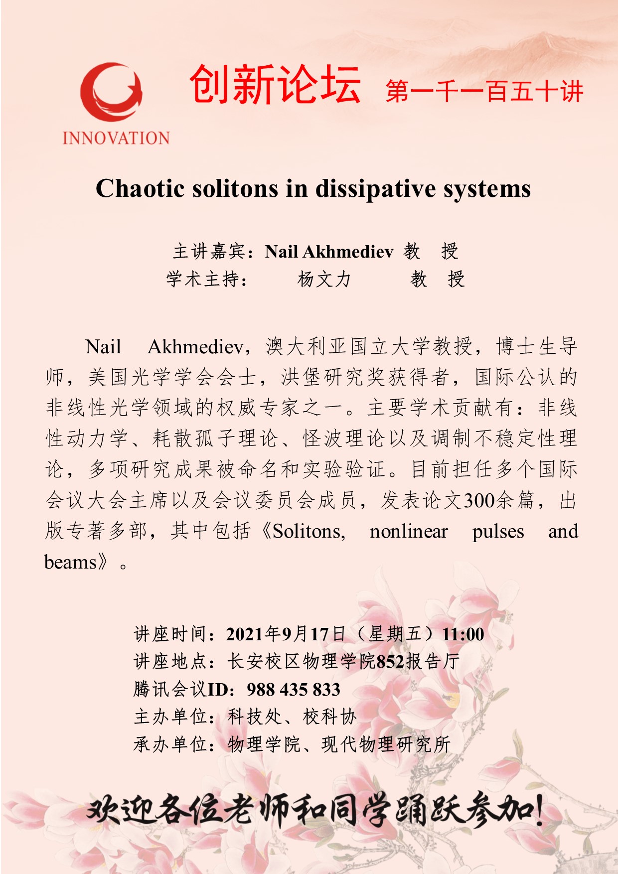 Nail Akhmediev 教授 MILAN.COM创新论坛第一千一百五十讲:Chaotic solitons in dissipative systems 讲座时间 2021年9月17日(星期五)11:00 讲座地点 长安校区物理学院852报告厅 讲座人介绍 Nail Akhmediev 教授 讲座内容