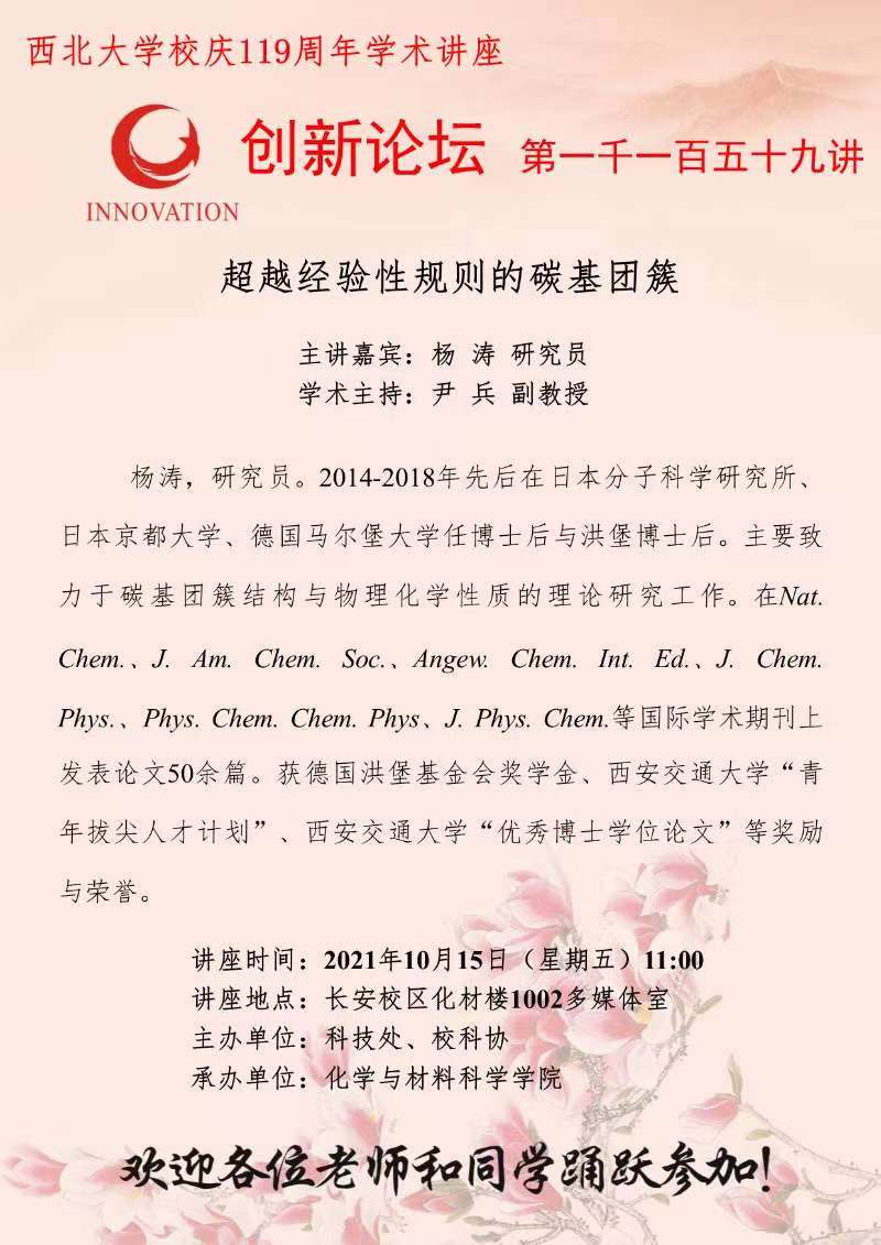 杨涛 研究员 MILAN.COM创新论坛第一千一百五十九讲暨校庆119周年学术讲座:超越经验性规则的碳基团簇 讲座时间 2021年10月15日(星期五)11:00 讲座地点 长安校区化材楼1002多媒体室 讲座人介绍 杨涛 研究员 讲座内容