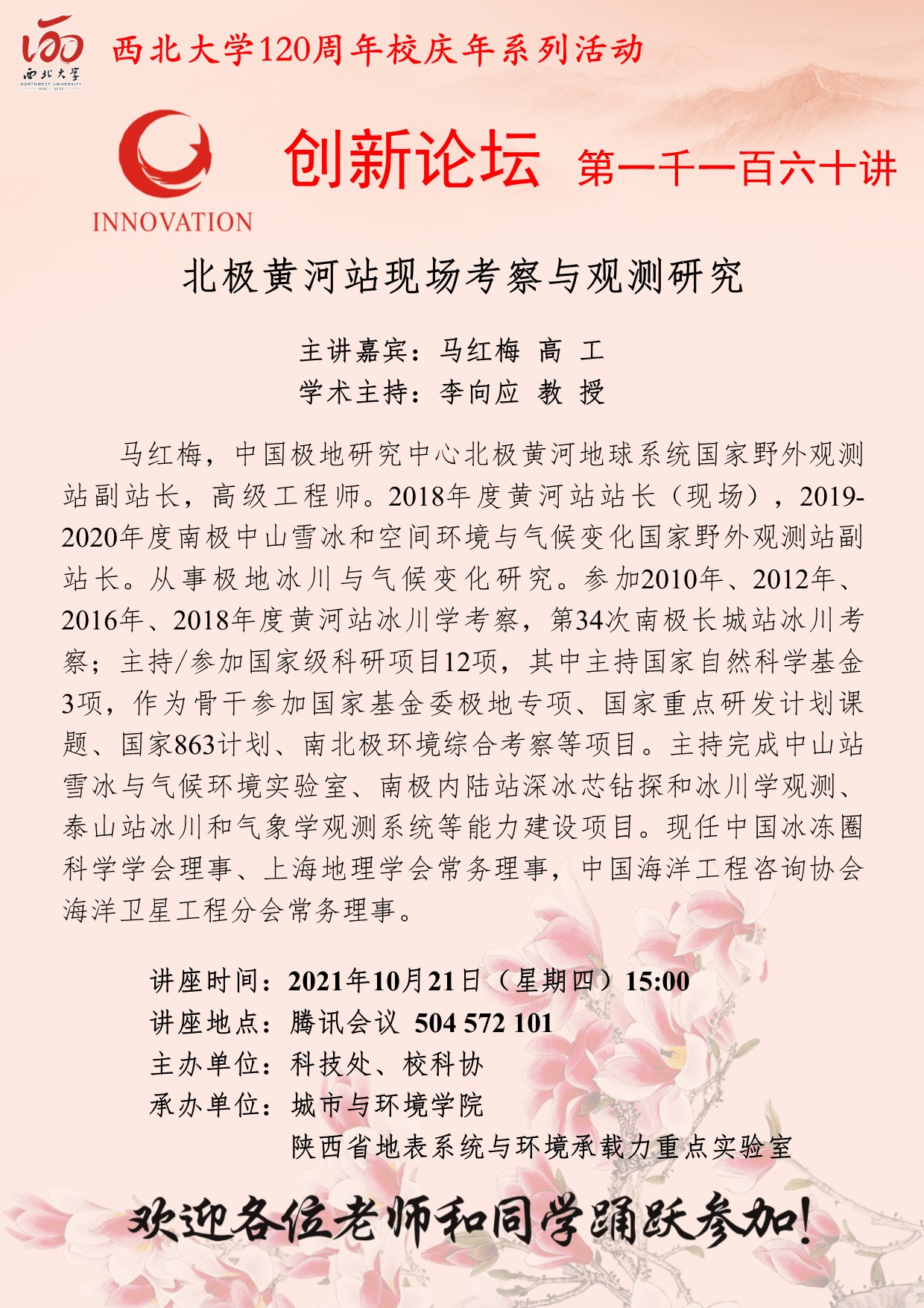 马红梅 高工 MILAN.COM创新论坛第一千一百六十讲暨120周年校庆年系列活动:北极黄河站现场考察与观测研究 讲座时间 2021年10月21日(星期四)15:00 讲座地点 腾讯会议 504 572 101 讲座人介绍 马红梅 高工 讲座内容