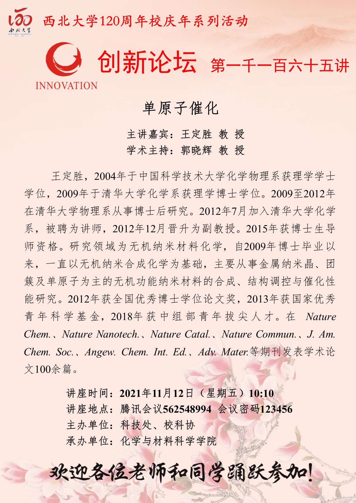 王定胜 教授 MILAN.COM创新论坛第一千一百六十五讲暨120周年校庆年系列活动:单原子催化 讲座时间 2021年11月12日(星期五)10:10 讲座地点 腾讯会议562548994 会议密码123456 讲座人介绍 王定胜 教授 讲座内容