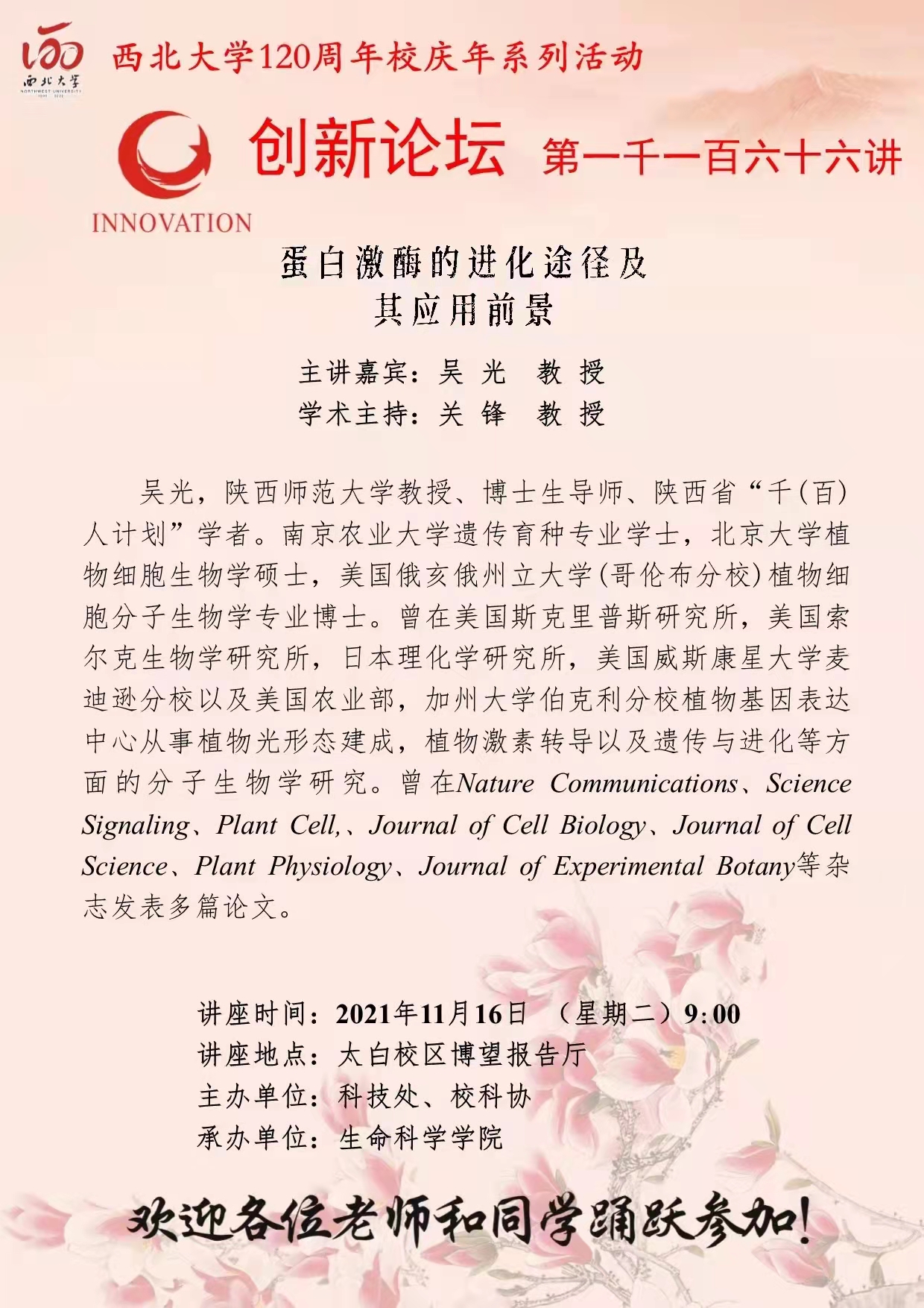 吴光 教授 MILAN.COM创新论坛第一千一百六十六讲暨120周年校庆年系列活动:蛋白激酶的进化途径及其应用前景 讲座时间 2021年11月16日 (星期二)9:00 讲座地点 太白校区博望报告厅 讲座人介绍 吴光 教授 讲座内容