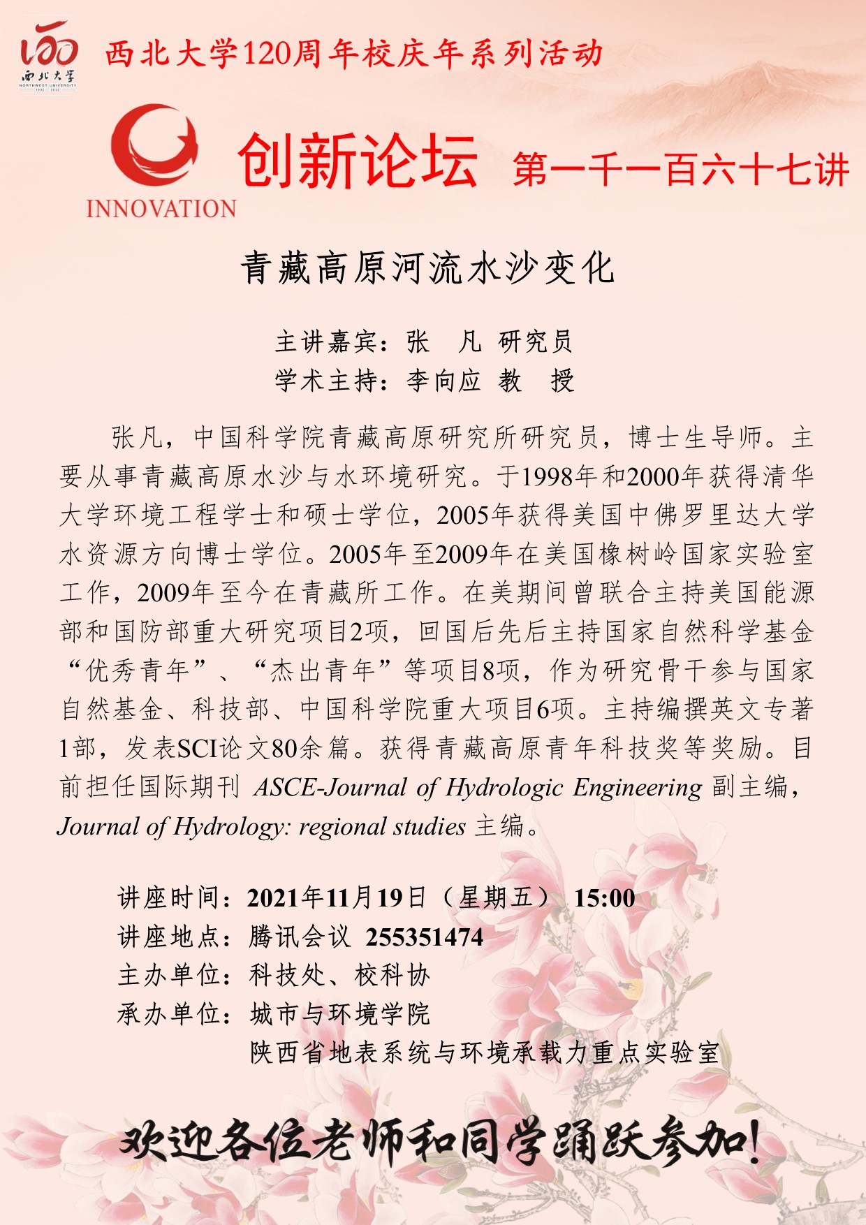 张凡 研究员 MILAN.COM创新论坛第一千一百六十七讲暨120周年校庆年系列活动:青藏高原河流水沙变化 讲座时间 2021年11月19日(星期五) 15:00 讲座地点 腾讯会议 255351474 讲座人介绍 张凡 研究员 讲座内容