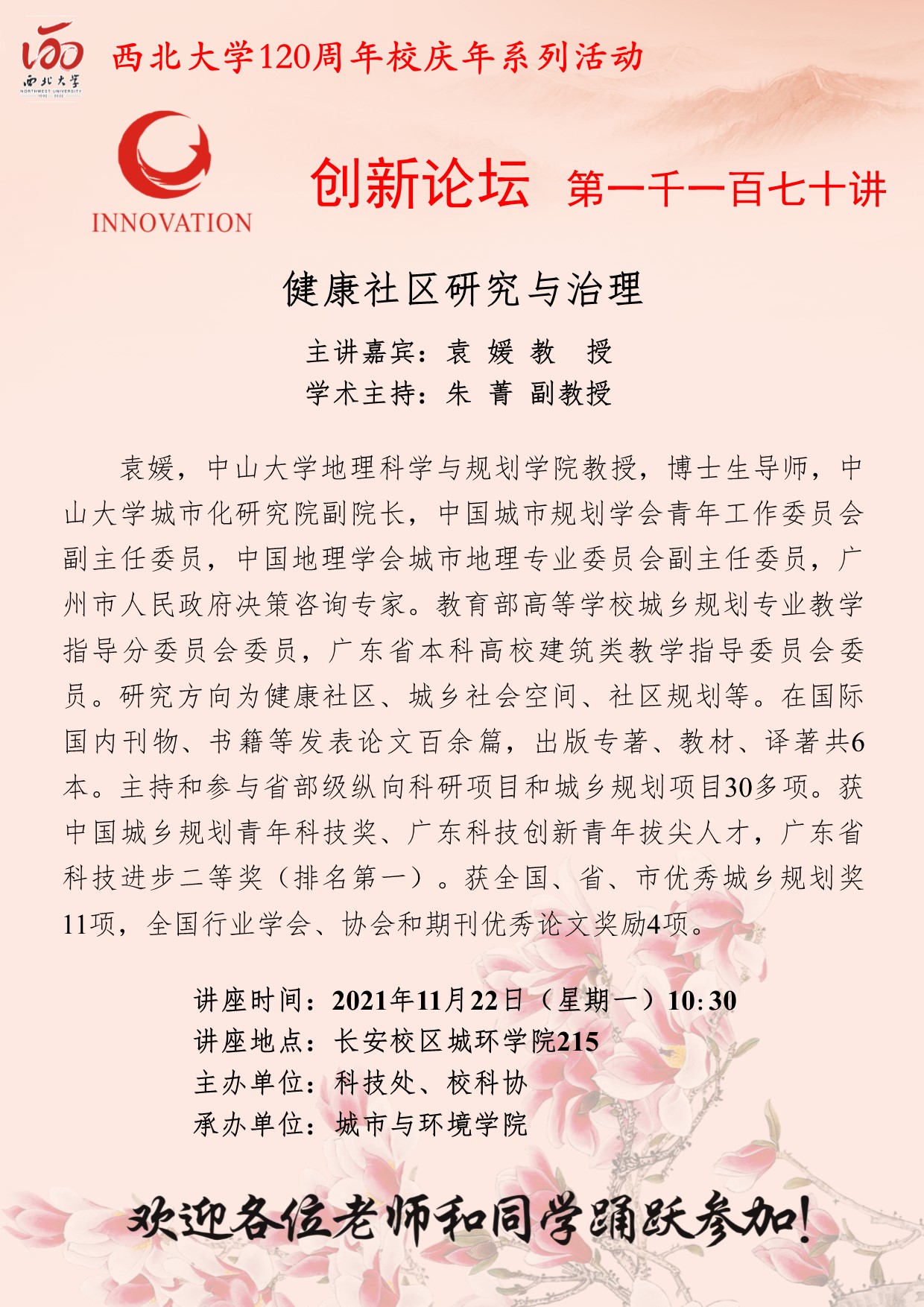 袁媛 教授 MILAN.COM创新论坛第一千一百七十讲暨120周年校庆年系列活动:健康社区研究与治理 讲座时间 2021年11月22日(星期一)10:30 讲座地点 长安校区城环学院215 讲座人介绍 袁媛 教授 讲座内容