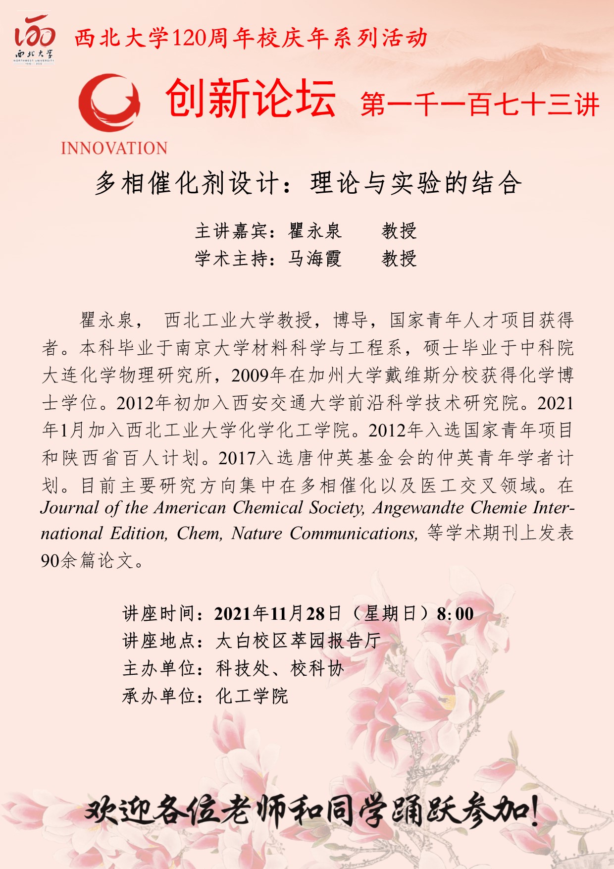 瞿永泉 教授 MILAN.COM创新论坛第一千一百七十三讲暨120周年校庆年系列活动:多相催化剂设计:理论与实验的结合 讲座时间 2021年11月28日(星期日)8:00 讲座地点 太白校区萃园报告厅 讲座人介绍 瞿永泉 教授 讲座内容