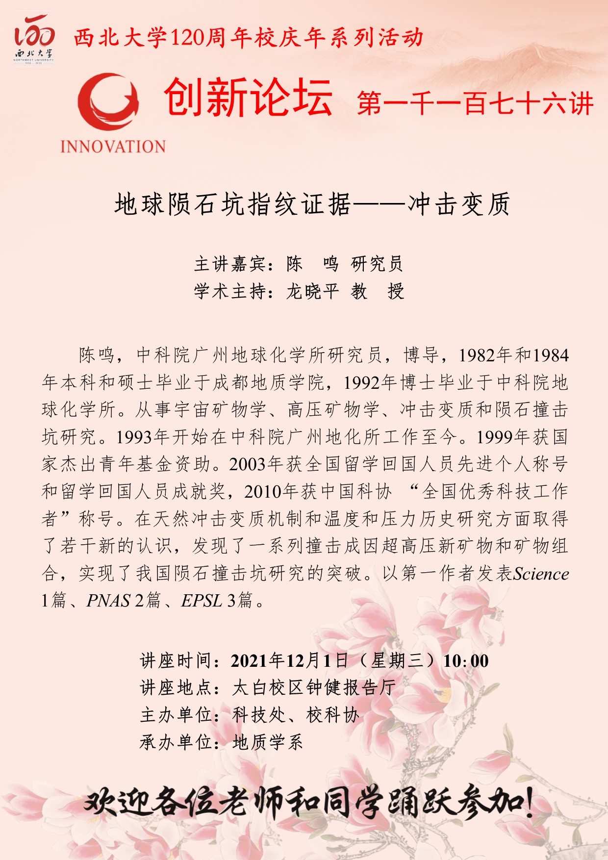 陈鸣 研究员 MILAN.COM创新论坛第一千一百七十六讲暨120周年校庆年系列活动:地球陨石坑指纹证据——冲击变质 讲座时间 2021年12月1日(星期三)10:00 讲座地点 太白校区钟健报告厅 讲座人介绍 陈鸣 研究员 讲座内容