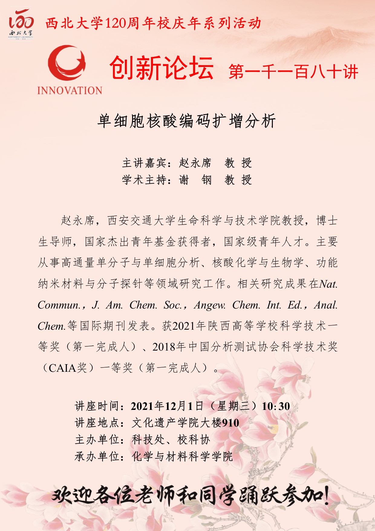 赵永席 教授 MILAN.COM创新论坛第一千一百八十讲暨120周年校庆年系列活动:单细胞核酸编码扩增分析 讲座时间 2021年12月1日(星期三)10:30 讲座地点 文化遗产学院大楼910 讲座人介绍 赵永席 教授 讲座内容