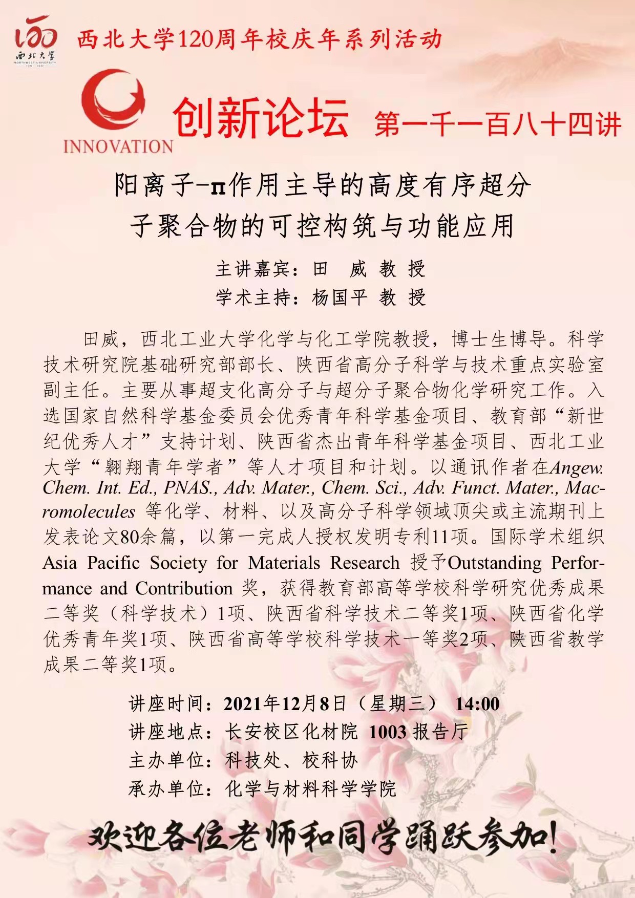 田威 教授 MILAN.COM创新论坛第一千一百八十四讲暨120周年校庆年系列活动:阳离子-π作用主导的高度有序超分子聚合物的可控构筑与功能应用 讲座时间 2021年12月8日(星期三) 14:00 讲座地点 长安校区化材院 1003 报告厅 讲座人介绍 田威 教授 讲座内容