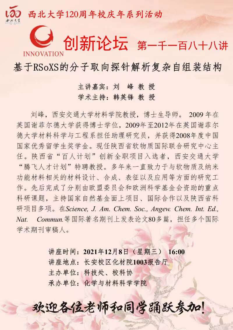 刘峰 教授 MILAN.COM创新论坛第一千一百八十八讲暨120周年校庆年系列活动:基于RSoXS的分子取向探针解析复杂自组装结构 讲座时间 2021年12月8日(星期三) 16:00 讲座地点 长安校区化材院1003报告厅 讲座人介绍 刘峰 教授 讲座内容