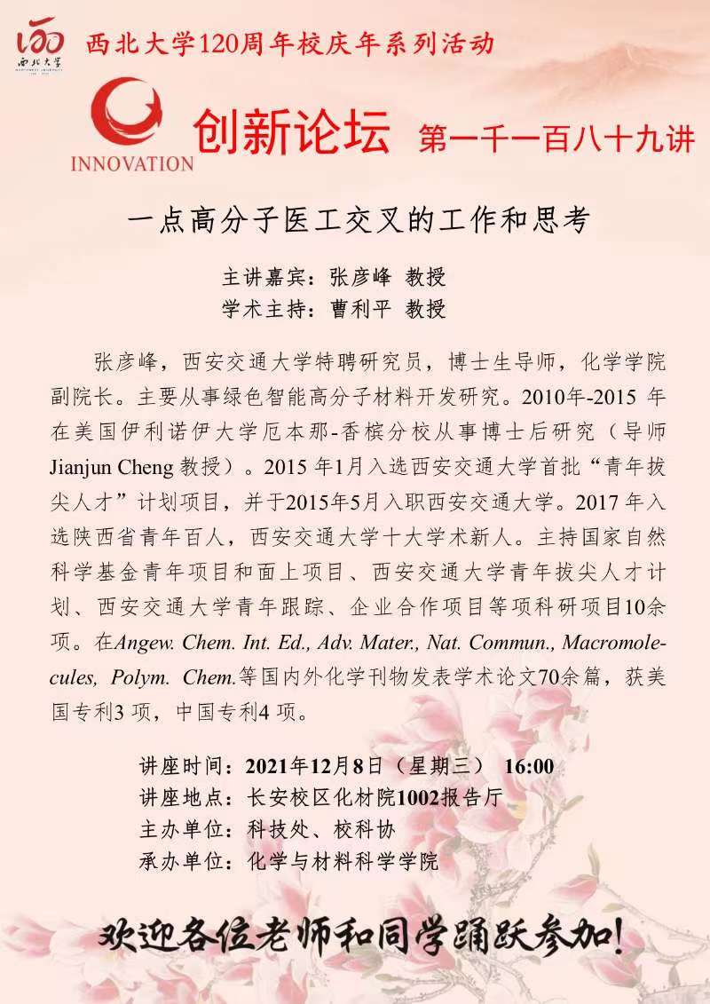 张彦峰 教授 MILAN.COM创新论坛第一千一百八十九讲暨120周年校庆年系列活动:一点高分子医工交叉的工作和思考 讲座时间 2021年12月8日(星期三) 16:00 讲座地点 长安校区化材院1002报告厅 讲座人介绍 张彦峰 教授 讲座内容